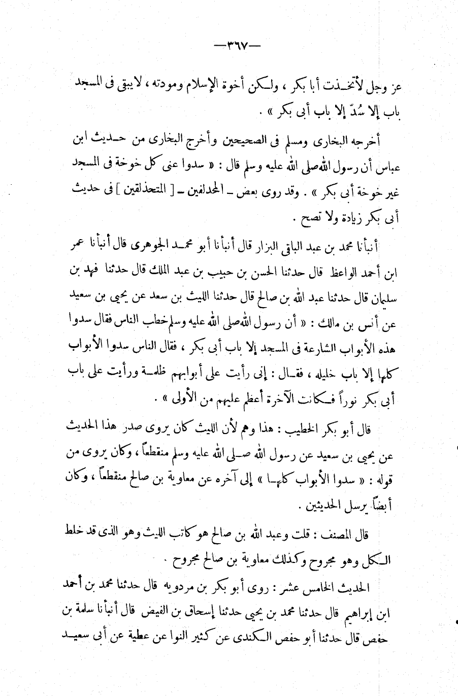 أَنْبَأَنَا مُحَمَّدُ بْنُ عَبْدِ الْبَاقِي الْبَزَّار قَالَ أَنبأَنَا أَبُو مُحَمَّد الجوهرى قَالَ أَنبأَنَا عمر ابْن أَحْمَدَ الْوَاعِظُ قَالَ حَدَّثَنَا الْحَسَنُ بن حبيب بن عبد الملك قَالَ حَدَّثَنَا فَهْدُ بْنُ سُلَيْمَانَ قَالَ حَدثنَا عبد الله بْنُ صَالِحٍ قَالَ حَدَّثَنَا اللَّيْثُ بْنُ سَعْدٍ عَنْ يَحْيَى بْنِ سَعِيدٍ عَنْ أَنَسِ بْنِ مَالِكٍ: " أَن رَسُول الله صَلَّى اللَّهُ عَلَيْهِ وَسَلَّمَ خَطَبَ النَّاسَ فَقَالَ سُدُّوا هَذِهِ الأَبْوَابَ الشَّارِعَةَ فِي الْمَسْجِدِ إِلا بَابَ أَبِي بَكْرٍ، فَقَالَ النَّاسُ سُدُّوا الأَبْوَابَ