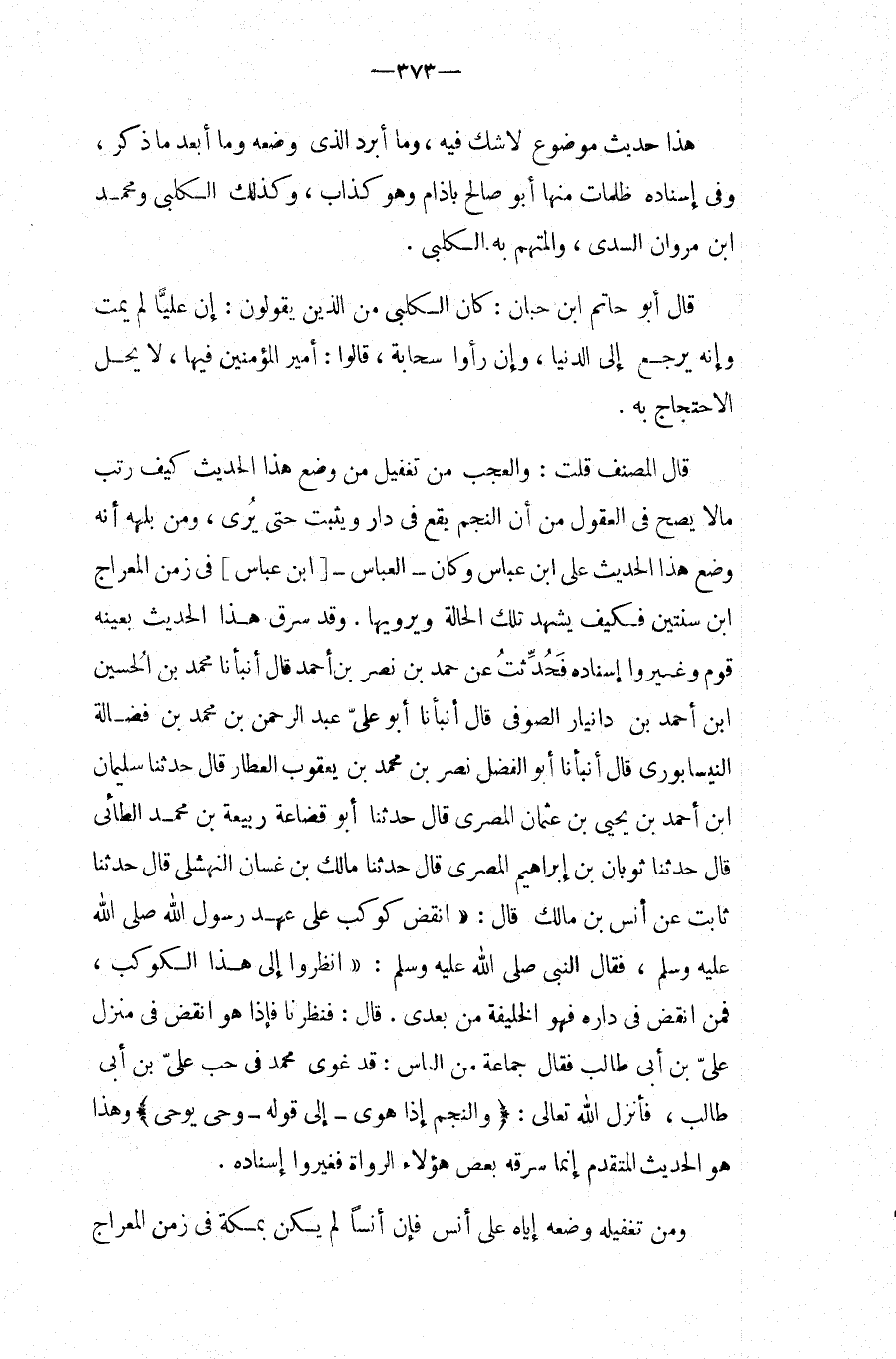 قَالَ المُصَنّف قَالَت: وَالْعجب من تغفيل من وضع هَذَا الحَدِيث كَيفَ رتب مَا لَا يَصح فِي الْعُقُول من أَن النَّجْم يَقع فِي دَار وَيثبت حَتَّى يرى، وَمن بلهه أَنه وضع هَذَا الحَدِيث على ابْن عَبَّاس وَكَانَ الْعَبَّاس [ابْن عَبَّاس] فِي زمن الْمِعْرَاج ابْن سنتَيْن فَكيف يشْهد تِلْكَ الْحَالة ويرويها.