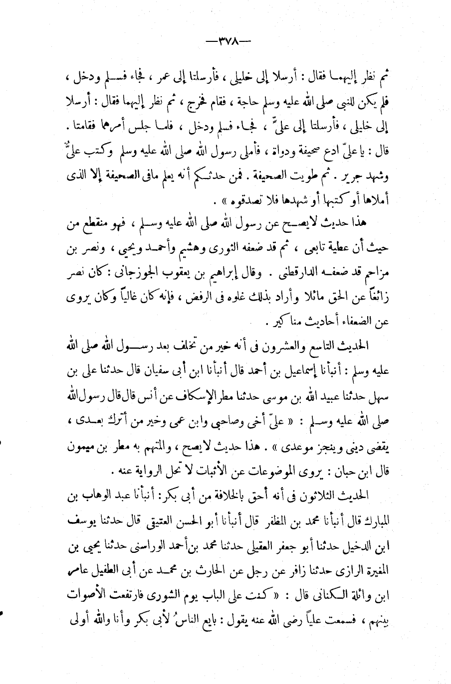 الحَدِيث الثَّلَاثُونَ فِي أَنه أَحَق بالخلافة من أبي بكر: أَنْبَأَنَا عَبْدُ الْوَهَّابِ بْنُ الْمُبَارَكِ قَالَ أَنْبَأَنَا مُحَمَّدُ بْنُ الْمُظَفَّرِ قَالَ أَنْبَأَنَا أَبُو الْحَسَنِ الْعُتَيْقِيُّ قَالَ حَدَّثَنَا يُوسُف ابْن الدَّخِيلِ حَدَّثَنَا أَبُو جَعْفَرٍ الْعُقَيْلِيُّ حَدَّثَنَا مُحَمَّدُ بْنُ أَحْمَدَ الْوَرَاسَنِيُّ حَدَّثَنَا يَحْيَى بْنُ الْمُغِيرَةِ الرَّازِيُّ حَدَّثَنَا زَافِرٌ عَنْ رَجُلٍ عَنِ الْحَارِثِ بْنِ مُحَمَّدٍ عَنْ أَبِي الطُّفَيْل عَامر ابْن وَائِلَةَ الْكِنَانِيِّ قَالَ: " كُنْتُ عَلَى الْبَابِ يَوْمَ الشُّورَى فَارْتَفَعَتِ الأَصْوَاتُ
