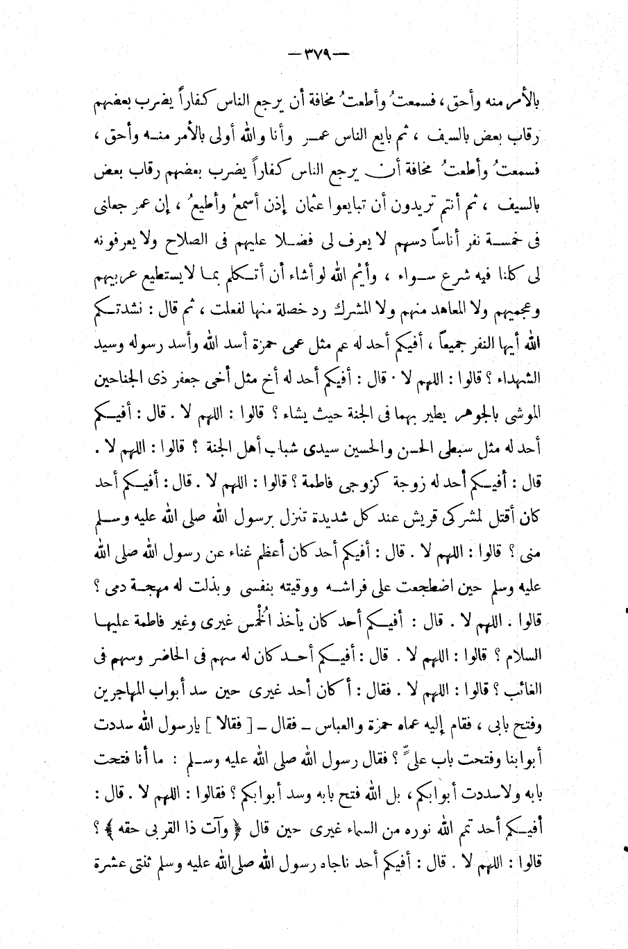بِالأَمْرِ مِنْهُ وَأَحَقُّ، فَسَمِعْتُ وَأَطَعْتُ مَخَافَةَ أَنْ يَرْجِعَ النَّاسُ كُفَّارًا يَضْرِبُ بَعْضُهُمْ رِقَابَ بَعْضٍ بِالسَّيْفِ، ثُمَّ بَايَعَ النَّاسُ عُمَرَ وَأَنَا وَاللَّهِ أَوْلَى بِالأَمْرِ مِنْهُ وَأَحَقُّ، فَسَمِعْتُ وَأَطَعْتُ مَخَافَةَ أَنْ يَرْجِعَ النَّاسُ كُفَّارًا يَضْرِبُ بَعْضُهُمْ رِقَابَ بَعْضٍ بِالسَّيْفِ، ثُمَّ أَنْتُمْ تُرِيدُونَ أَنْ تُبَايِعُوا عُثْمَانَ إِذَنْ أَسْمَعُ وَأُطِيعُ، إِنَّ عُمَرَ جَعَلَنِي فِي خَمْسَة نفر أُنَاسًا دَسَّهُمْ لَا يُعْرَفُ لِي فَضْلا عَلَيْهِمْ فِي الصَّلاحِ وَلا يَعْرِفُونَهُ لِي كُلُّنَا فِيهِ شَرْعٌ سَوَاءٌ، وَأَيْمُ اللَّهِ لَوْ أَشَاءُ أَنْ أَتَكَلَّمَ بِمَا لَا يَسْتَطِيعُ عَرَبِيُّهُمْ وَعَجَمِيُّهُمْ وَلا الْمُعَاهِدُ مِنْهُمْ وَلا الْمُشْرِكُ رَدَّ خَصْلَةٍ مِنْهَا لَفَعَلْتُ، ثُمَّ قَالَ: نَشَدْتُكُمُ اللَّهَ أَيُّهَا النَّفَرُ جَمِيعًا، أَفِيكُمْ أَحَدٌ لَهُ عَمٌّ مِثْلُ عَمِّي حَمْزَةَ أَسَدِ اللَّهِ وَأَسَدِ رَسُولِهِ وَسَيِّدِ الشُّهَدَاءِ؟ قَالُوا: اللَّهُمَّ لَا.