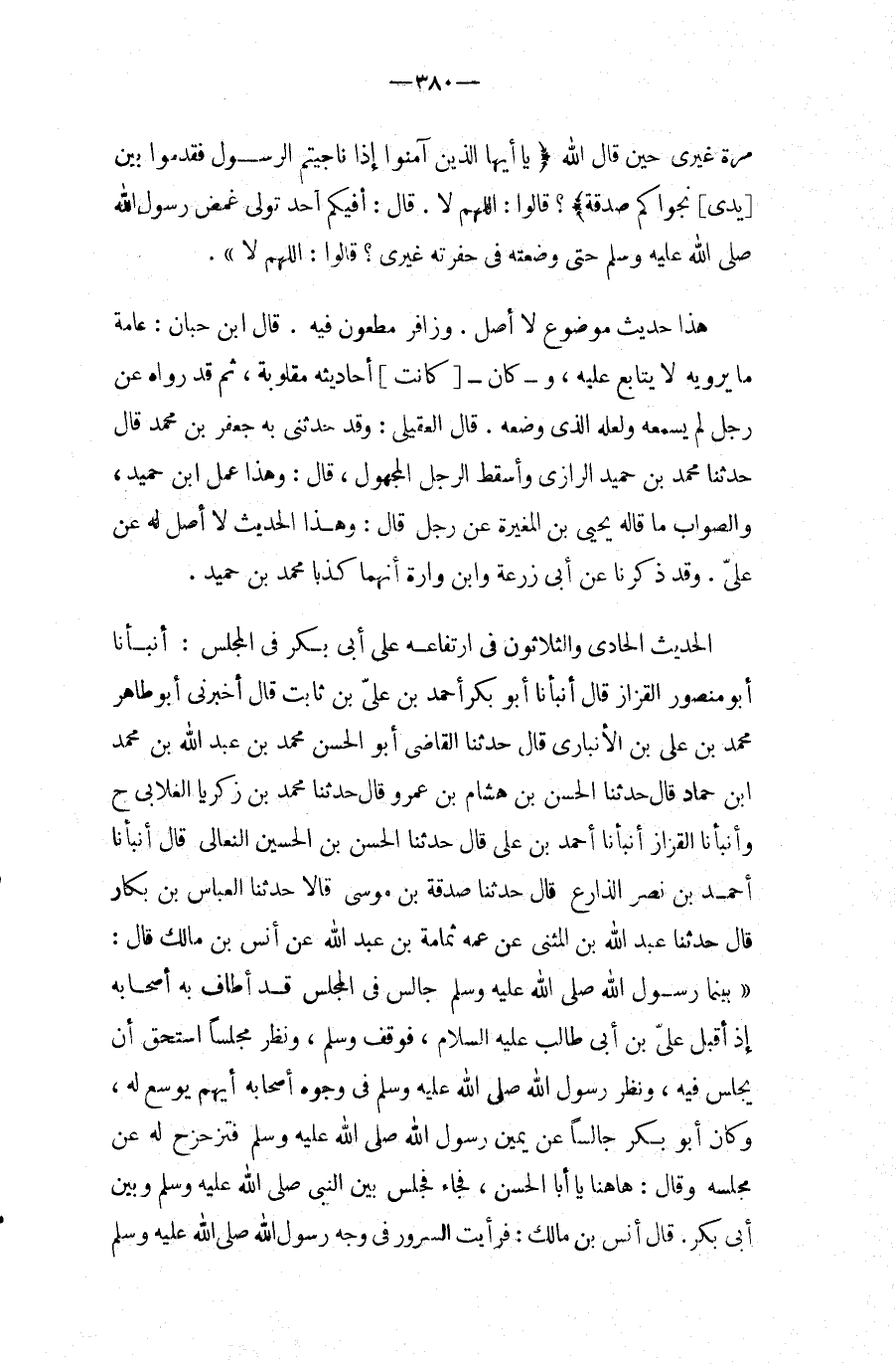 الحَدِيث الْحَادِي وَالثَّلَاثُونَ فِي ارتفاعه على أبي بكر فِي الْمجْلس: أَنْبَأَنَا أَبُو مَنْصُور الْقَزاز قَالَ أَنبأَنَا أَبُو بكر أَحْمد بن عَليّ بن ثَابت قَالَ أَخْبرنِي أَبُو طَاهِرٍ مُحَمَّدُ بْنُ عَلِيِّ بْنِ الأَنْبَارِيِّ قَالَ حَدَّثَنَا الْقَاضِي أَبُو الْحسن مُحَمَّد بن عبد الله بن مُحَمَّد ابْن حَمَّادٍ قَالَ حَدَّثَنَا الْحَسَنُ بْنُ هِشَامِ بْنِ عَمْرٍو قَالَ حَدَّثَنَا مُحَمَّدُ بْنُ زَكَرِيَّا الْغِلابِيُّ ح وَأَنْبَأَنَا الْقَزَّازُ أَنْبَأَنَا أَحْمَدُ بْنُ عَلِيٍّ قَالَ حَدَّثَنَا الْحَسَنُ بْنُ الْحُسَيْنِ النِّعَالِيُّ قَالَ أَنْبَأَنَا أَحْمَدُ بْنُ نَصْرٍ الذَّارِعُ قَالَ حَدَّثَنَا صَدَقَةُ بْنُ مُوسَى قَالا حَدَّثَنَا الْعَبَّاسُ بْنُ بَكَّارٍ قَالَ حَدَّثَنَا عبد الله بْنُ الْمُثَنَّى عَنْ عَمِّهِ ثُمَامَةَ بن عبد الله عَنْ أَنَسِ بْنِ مَالِكٍ قَالَ: " بَيْنَمَا رَسُول الله صَلَّى اللَّهُ عَلَيْهِ وَسَلَّمَ جَالِسٌ فِي الْمَجْلِسِ قَدْ أَطَافَ بِهِ أَصْحَابُهُ إِذْ أَقْبَلَ عَلِيُّ بْنُ أَبِي طَالِبٍ عَلَيْهِ السَّلامُ، فَوَقَفَ وَسَلَّمَ، وَنَظَرَ مَجْلِسًا اسْتَحَقَّ أَنْ