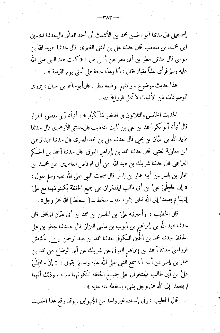 الحَدِيث الْخَامِس وَالثَّلَاثُونَ فِي افتخار ملكيه بِهِ: أَنْبَأَنَا أَبُو مَنْصُورٍ الْقَزَّازُ قَالَ أَنبأَنَا أَبُو بكر أَحْمد بْنُ عَلِيِّ بْنِ ثَابِتٍ الْخَطِيبُ قَالَ حَدَّثَنِي الأَزْهَرُيُّ قَالَ حَدَّثَنَا عبيد الله بْنُ عُثْمَانَ بْنِ يَحْيَى قَالَ حَدَّثَنَا عَلِيُّ بْنُ مُحَمَّدٍ الْمِصْرِيُّ قَالَ حَدثنَا عبد الرحمن ابْن مُعَاوِيَةَ الْعُتْبِيُّ قَالَ حَدَّثَنَا مُحَمَّدُ بْنُ إِبْرَاهِيمَ الْعَوْفِيُّ قَالَ حَدَّثَنَا أَحْمَدُ بْنُ الْحَكَمِ الْبَرَاجِمِيُّ قَالَ حَدثنَا شريك بن عبد الله عَنْ أَبِي الْوَقَّاصِ الْعَامِرِيِّ عَنْ مُحَمَّدِ بْنِ عَمَّارِ بْنِ يَاسِرٍ عَنْ أَبِيهِ عَمَّارِ بْنِ يَاسِرٍ قَالَ سَمِعْتُ النَّبِيَّ صَلَّى اللَّهُ عَلَيْهِ وَسَلَّمَ يَقُولُ: " إِنَّ حَافِظَيْ عَلِيِّ بْنِ أَبِي طَالِبٍ لَيَفْتَخِرَانِ على جَمِيع الْحفظَة بكينو نتهما مَعَ عَلِيٍّ إِنَّهُمَا لَمْ يَصْعَدَا إِلَى الله تَعَالَى بشئ مِنْهُ سخط [يسْخط] الله عزوجل ".