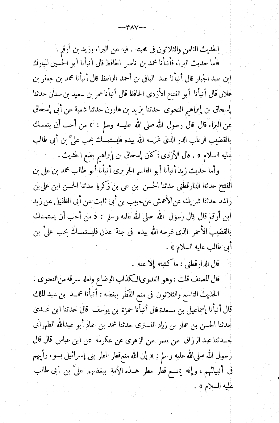 الحَدِيث التَّاسِع وَالثَّلَاثُونَ فِي منع الْقطر ببغضه: أَنبأَنَا مُحَمَّد بن عبد الملك قَالَ أَنْبَأَنَا إِسْمَاعِيلُ بْنُ مَسْعَدَةَ قَالَ أَنبأَنَا حَمْزَة بن يُوسُف قَالَ حَدَّثَنَا ابْنُ عَدِيٍّ حَدَّثَنَا الْحَسَنُ بْنُ عَمَّارِ بْنِ زِيَادٍ التُّسْتَرِيُّ حَدَّثَنَا مُحَمَّدُ بْنُ حَمَّادٍ أَبُو عَبْدِ اللَّهِ الطَّهْرَانِيُّ حَدَّثَنَا عَبْدُ الرَّزَّاقِ عَنْ يَعْمُرَ عَنِ الزُّهْرِيِّ عَنْ عِكْرِمَةَ عَنِ ابْنِ عَبَّاسٍ قَالَ قَالَ رَسُولُ اللَّهِ صَلَّى اللَّهُ عَلَيْهِ وَسَلَّمَ: " أَنْ اللَّهَ مَنَعَ قَطْرَ الْمَطَرِ بَنِي إِسْرَائِيلَ بِسُوءِ رَأْيِهِمْ فِي أَنْبِيَائِهِمْ، وَإِنَّهُ يُمْنَعُ قَطْرُ مَطَرِ هَذِهِ الأُمَّةِ بِبُغْضِهِمْ عَلِيِّ بْنِ أَبِي طَالب عَلَيْهِ السَّلَام ".