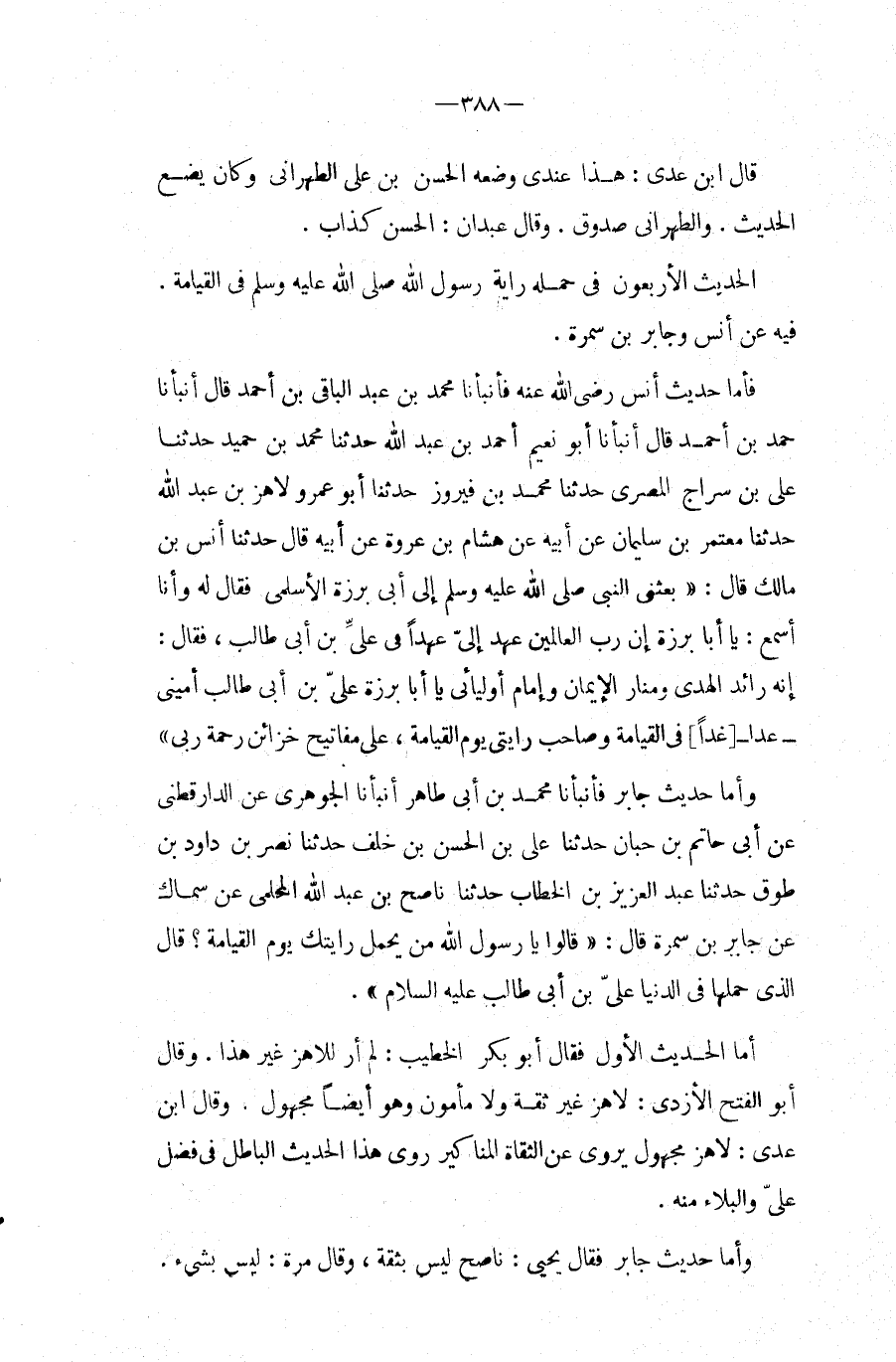 مَالِكٍ قَالَ: " بَعَثَنِي النَّبِيُّ صَلَّى اللَّهُ عَلَيْهِ وَسَلَّمَ إِلَى أَبِي بَرْزَةَ الأَسْلَمِيِّ فَقَالَ لَهُ وَأَنَا أَسْمَعُ: يَا أَبَا بَرْزَةَ إِنَّ رَبَّ الْعَالَمِينَ عَهِدَ إِلَيَّ عَهْدًا فِي عَلِيِّ بْنِ أَبِي طَالِبٍ، فَقَالَ: إِنَّهُ رَائِدُ الْهُدَى وَمَنَارُ الإِيمَانِ وَإِمَامُ أَوْلِيَائِي يَا أَبَا بَرْزَةَ عَلِيُّ بْنُ أَبِي طَالب أمينى عدا [غَدًا] فِي الْقِيَامَةِ وَصَاحِبُ رَايَتِي يَوْمَ الْقِيَامَةِ، عَلِيٌّ مَفَاتِيحُ خَزَائِنِ رَحْمَة ربى " وَأما حَدِيث جَابِر فَأَنْبَأَنَا مُحَمَّدُ بْنُ أَبِي طَاهِرٍ أَنْبَأَنَا الْجَوْهَرِيُّ عَنِ الدَّارَقُطْنِيّ عَن أبي حَاتِم بن حَبَّانَ حَدَّثَنَا عَلِيُّ بْنُ الْحَسَنِ بْنِ خَلَفٍ حَدَّثَنَا نَصْرُ بْنُ دَاوُدَ بْنِ طَوْقٍ حَدَّثَنَا عَبْدُ الْعَزِيزِ بْنُ الْخَطَّابِ حَدَّثَنَا نَاصِحُ بن عبد الله الْمَحْلَمِيُّ عَنْ سِمَاكٍ عَنْ جَابِرِ بْنِ سَمُرَةَ قَالَ: " قَالُوا يَا رَسُول الله من يحمل رَايَتك يَوْمَ الْقِيَامَةِ؟ قَالَ الَّذِي حَمَلَهَا فِي الدُّنْيَا عَليّ بن أبي طَالِبٍ عَلَيْهِ السَّلامُ ".