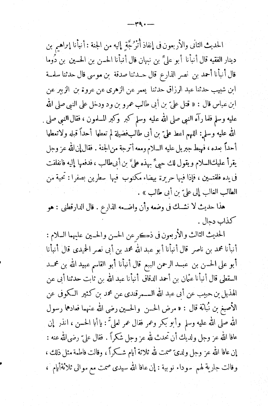 الحَدِيث الثَّالِث وَالْأَرْبَعُونَ فِي ذكر عَن الْحسن وَالْحُسَيْن عَلَيْهِمَا السَّلَام: أَنْبَأَنَا مُحَمَّدُ بْنُ نَاصِرٍ قَالَ أَنْبَأَنَا أَبُو عبد الله مُحَمَّد بن أَبِي نَصْرٍ الْحُمَيْدِيُّ قَالَ أَنْبَأَنَا أَبُو على الْحسن بن عبد الرحمن الْبَيِّعُ قَالَ أَنْبَأَنَا أَبُو الْقَاسِم عبيد الله بْنُ مُحَمَّدٍ السَّقَطِيُّ قَالَ أَنْبَأَنَا عُثْمَانُ بْنُ أَحْمَدَ الدَّقَّاقُ أَنْبَأَنَا عبد الله بْنُ ثَابِتٍ حَدَّثَنَا أَبِي عَنِ الْهُذَيْلِ بْنِ حَبِيبٍ عَنْ أَبِي عبد الله السَّمَرْقَنْدِيِّ عَنْ مُحَمَّدِ بْنِ كَثِيرٍ الْكُوفِيِّ عَنْ الأَصْبَغِ بْنِ نَبَاتَةَ قَالَ: " مَرِضَ الْحَسَنُ وَالْحُسَيْنُ رَضِيَ اللَّهُ عَنْهُمَا فَعَادَهُمَا رَسُولُ اللَّهِ صَلَّى اللَّهُ عَلَيْهِ وَسَلَّمَ وَأَبُو بَكْرٍ وَعُمَرُ فَقَالَ عُمَرُ لِعَلِيٍّ: يَا أَبَا الْحَسَنِ، انْذِرْ إِنْ عافا الله عزوجل ولديك أَن تحدث لله عزوجل شُكْرًا.