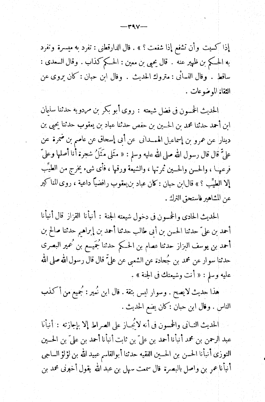 الحَدِيث الْخَمْسُونَ فِي فضل شيعته: رَوَى أَبُو بَكْرِ بْنُ مَرْدَوَيْهِ حَدَّثَنَا سُلَيْمَان ابْن أَحْمَدَ حَدَّثَنَا مُحَمَّدُ بْنُ الْحُسَيْنِ بْنِ حَفْصٍ حَدَّثَنَا عَبَّادُ بْنُ يَعْقُوبَ حَدَّثَنَا يَحْيَى بْنُ دِينَارٍ عَنْ عَمْرِو بْنِ إِسَماعِيلَ الْهَمَدَانِيِّ عَنْ أَبِي إِسْحَاقَ عَنْ عَاصِمِ بْنِ ضَمْرَةَ عَنْ عَلِيٍّ قَالَ قَالَ رَسُول الله صَلَّى اللَّهُ عَلَيْهِ وَسَلَّمَ: " مَثَلِي مَثَلُ شَجَرَةٍ أَنَا أَصْلُهَا وَعَلِيٌّ فَرْعُهَا، وَالْحَسَنُ وَالْحُسَيْنُ ثَمَرَتُهَا، وَالشِّيعَةُ وَرَقُهَا، فَأَيَّ شئ يَخْرُجُ مِنَ الطَّيِّبِ إِلا الطَّيِّبَ؟ " قَالَ ابْنُ حِبَّانَ: كَانَ عباد بن يَعْقُوب رَافِضِيًّا دَاعِيَة، روى الْمَنَاكِير عَن الْمَشَاهِير فَاسْتحقَّ التّرْك.