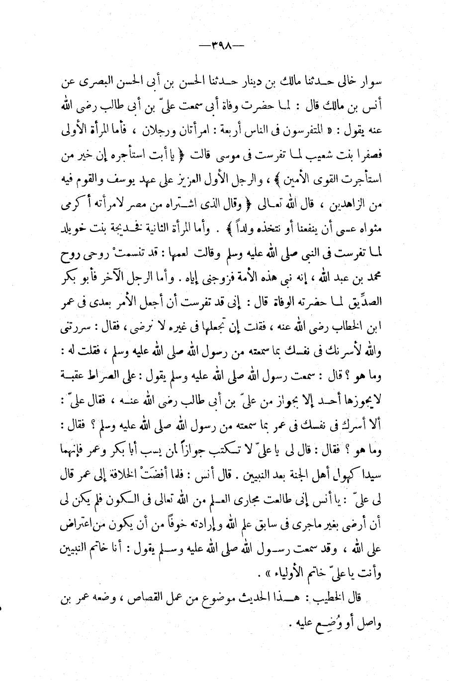 وَأَمَّا الرَّجُلُ الآخَرُ فَأَبُو بَكْرٍ الصِّدِّيقُ لَمَّا حَضَرَتْهُ الْوَفَاةُ قَالَ: إِنِّي قَدْ تَفَرَّسْتُ أَنْ أَجْعَلَ الأَمْرَ بَعْدِي فِي عُمَرَ ابْن الْخَطَّابِ رَضِيَ اللَّهُ عَنْهُ، فَقُلْتُ إِنْ تَجْعَلَهَا فيِ غَيْرِهِ لَا نَرْضَى، فَقَالَ: سَرَرْتَنِي وَاللَّهِ لأَسُرَّنَّكَ فِي نَفْسِكَ بِمَا سَمِعْتُهُ مِنْ رَسُول الله صَلَّى اللَّهُ عَلَيْهِ وَسَلَّمَ، فَقُلْتُ لَهُ: وَمَا هُوَ؟ قَالَ: سَمِعت رَسُول الله صَلَّى اللَّهُ عَلَيْهِ وَسَلَّمَ يَقُولُ: عَلَى الصِّرَاطِ عَقَبَةٌ لَا يَجُوزُهَا أَحَدٌ إِلا بِجَوَازٍ مِنْ عَلِيِّ بْنِ أبي طَالب رَضِي الله عَنهُ، فَقَالَ عَلِيٌّ: أَلا أَسُرُّكَ فِي نَفْسِكَ فِي عُمَرَ بِمَا سَمِعْتُهُ مِنْ رَسُولِ اللَّهِ صَلَّى اللَّهُ عَلَيْهِ وَسَلَّمَ؟ فَقَالَ: وَمَا هُوَ؟ فَقَالَ: قَالَ لِي يَا عَلِيُّ لَا تَكْتُبُ جَوَازًا لِمَنْ يَسُبُّ أَبَا بَكْرٍ وَعُمَرَ فَإِنَّهُمَا