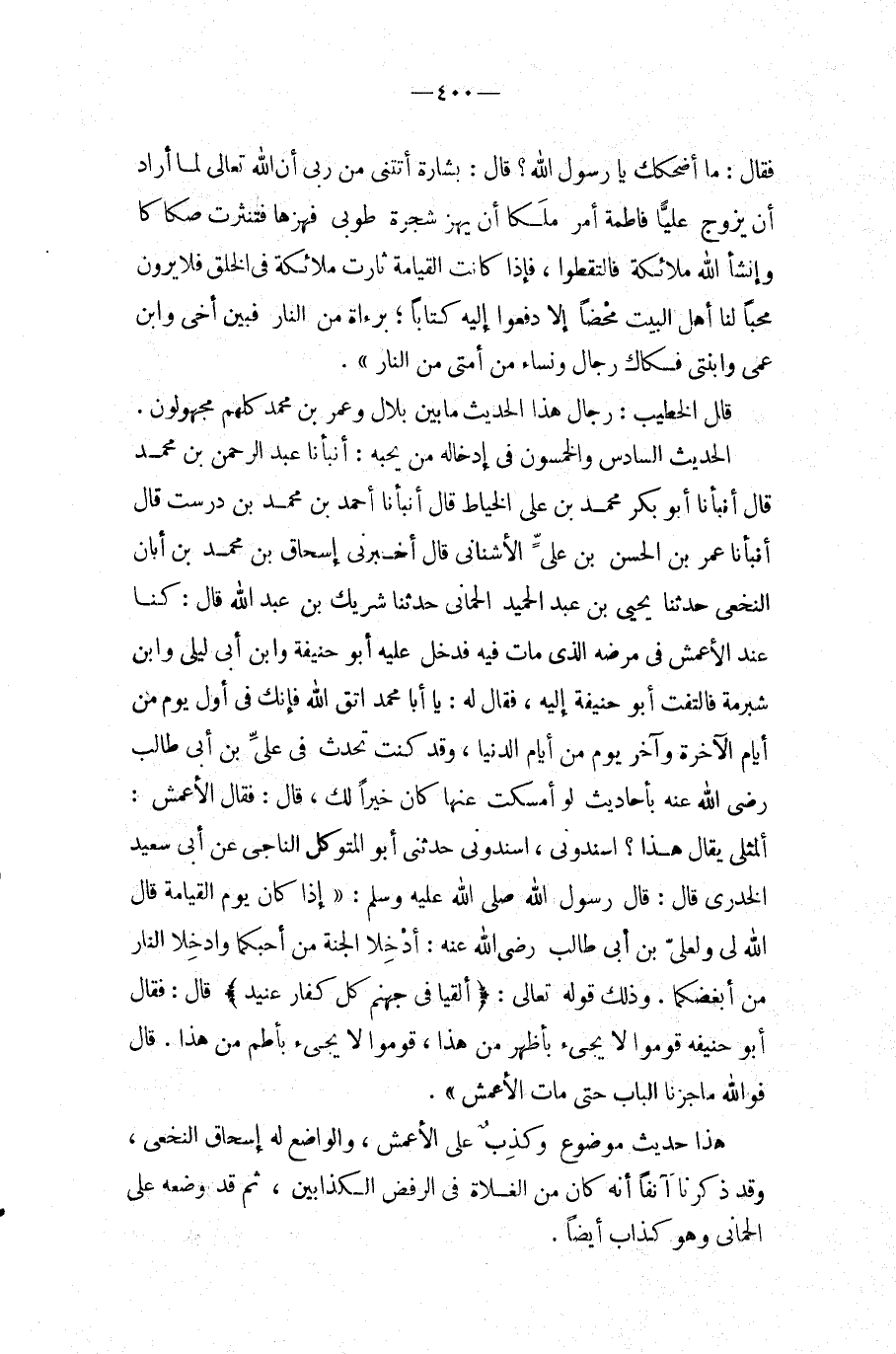 هَذَا حَدِيث مَوْضُوع وَكذب على الْأَعْمَش، والواضع لَهُ إِسْحَاق النَّخعِيّ، وَقد ذكرنَا آنِفا أَنه كَانَ من الغلاة فِي الرَّفْض الْكَذَّابين، ثمَّ قد وَضعه عَليّ الحمانى وَهُوَ كَذَّاب أَيْضا.