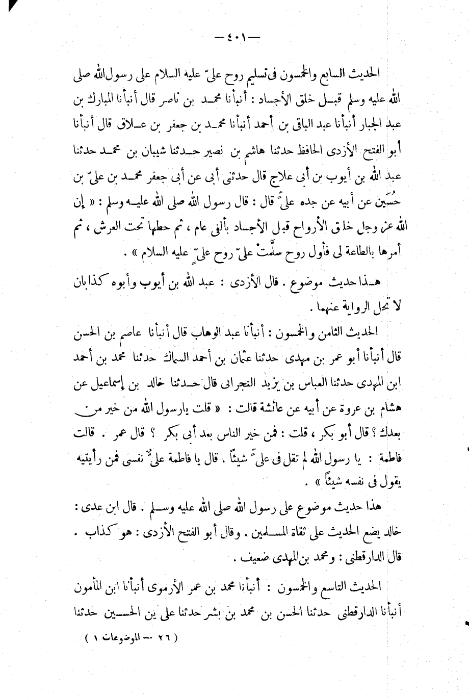 الحَدِيث التَّاسِع وَالْخَمْسُونَ: أَنْبَأَنَا مُحَمَّدُ بْنُ عُمَرَ الأَرْمَوِيُّ أَنْبَأَنَا ابْنُ الْمَأْمُونِ أَنْبَأَنَا الدَّارَقُطْنِيُّ حَدَّثَنَا الْحَسَنُ بْنُ مُحَمَّدِ بْنِ بِشْرٍ حَدَّثَنَا عَلِيُّ بن الْحُسَيْن حَدثنَا (26 الموضوعات 1)