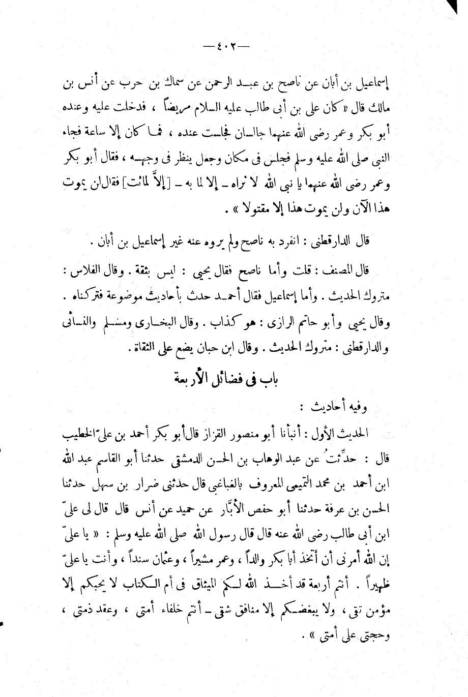بَاب فِي فَضَائِل الْأَرْبَعَة وَفِيه أَحَادِيث: الحَدِيث الأول: أَنْبَأَنَا أَبُو مَنْصُورٍ الْقَزَّازُ قَالَ أَبُو بَكْرٍ أَحْمَدُ بْنُ عَلِيٍّ الْخَطِيبُ قَالَ: حُدِّثْتُ عَنْ عَبْدِ الْوَهَّابِ بْنِ الْحَسَنِ الدِّمَشْقِي حَدثنَا أَبُو الْقَاسِم عبد الله ح ابْن أَحْمَدَ بْنِ مُحَمَّدٍ التَّمِيمِيُّ الْمَعْرُوفُ بِالْغَبَاغِبِيِّ قَالَ حَدَّثَنِي ضِرَارُ بْنُ سَهْلٍ حَدَّثَنَا الْحَسَنُ بْنُ عَرَفَةَ حَدَّثَنَا أَبُو حَفْصٍ الأَبَّارُ عَنْ حُمَيْدٍ عَنْ أَنَسٍ قَالَ قَالَ لى على ابْن أبي طَالب رَضِي الله عَنهُ قَالَ قَالَ رَسُول الله صَلَّى اللَّهُ عَلَيْهِ وَسَلَّمَ: " يَا عَلِيُّ إِنَّ اللَّهَ أَمَرَنِي أَنْ أَتَّخِذَ أَبَا بَكْرٍ وَالِدًا، وَعُمَرَ مُشِيرًا، وَعُثْمَانَ سَنَدًا، وَأَنْتَ يَا عَلِيُّ ظَهِيرًا.