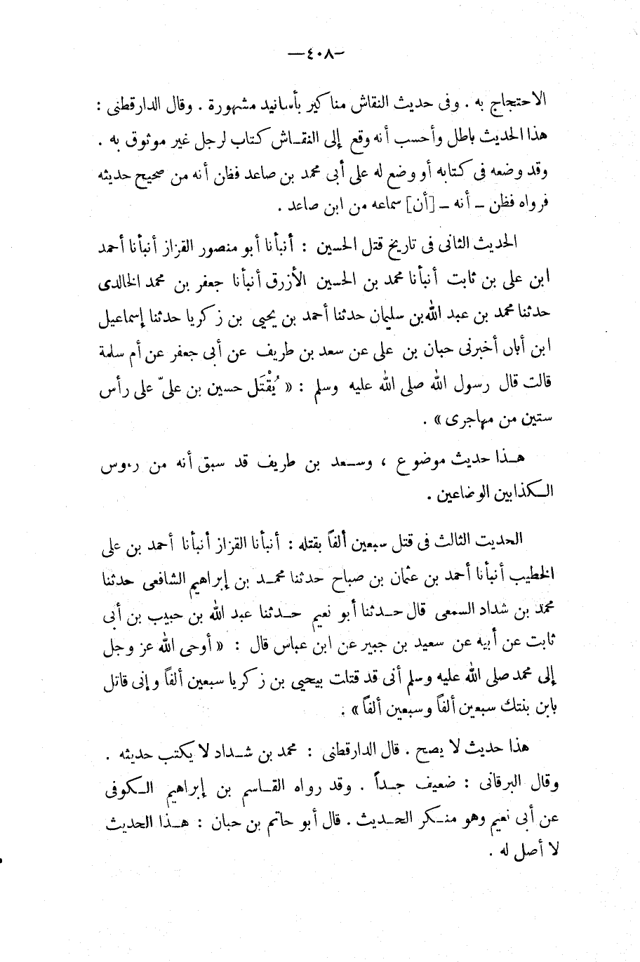 الحَدِيث الثَّالِث فِي قتل سبعين ألفا بقتْله: أَنْبَأَنَا الْقَزَّازُ أَنْبَأَنَا أَحْمَدُ بْنُ عَلِيٍّ الْخَطِيبُ أَنْبَأَنَا أَحْمَدُ بْنُ عُثْمَانَ بْنِ صَبَّاحٍ حَدَّثَنَا مُحَمَّدُ بْنُ إِبْرَاهِيمَ الشَّافِعِيُّ حَدَّثَنَا مُحَمَّدُ بْنُ شَدَّادٍ السَّمَعِيُّ قَالَ حَدثنَا أَبُو نعيم حَدثنَا عبد الله بْنُ حَبِيبِ بْنِ أَبِي ثَابِتٍ عَنْ أَبِيهِ عَنْ سَعِيدِ بْنِ جُبَيْرٍ عَنِ ابْنِ عَبَّاسٍ قَالَ: " أوحى الله عزوجل إِلَى مُحَمَّدٍ صَلَّى اللَّهُ عَلَيْهِ وَسَلَّمَ أَنِي قَدْ قَتَلْتُ بِيَحْيَى بْنِ زَكَرِيَّا سَبْعِينَ أَلْفًا وَإِنِّي قَاتِلٌ بِابْنِ بِنْتِكَ سَبْعِينَ أَلْفًا وَسَبْعِينَ أَلْفًا ".
