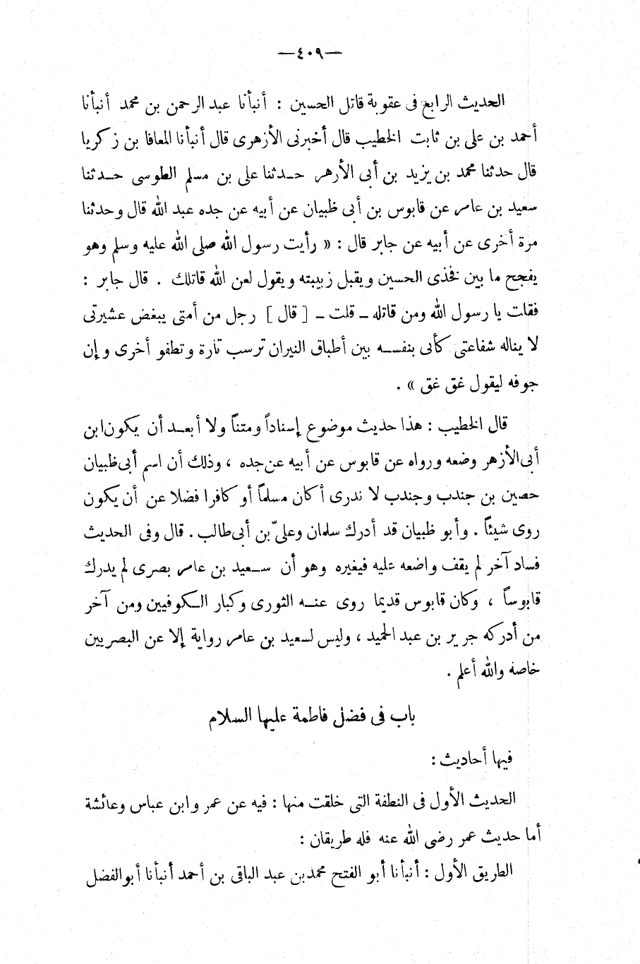 الحَدِيث الرَّابِع فِي عُقُوبَة قَاتل الْحُسَيْن: أَنبأَنَا عبد الرحمن بْنُ مُحَمَّدٍ أَنْبَأَنَا أَحْمَدُ بْنُ عَلِيِّ بْنِ ثَابِتٍ الْخَطِيبُ قَالَ أَخْبرنِي الازهرى قَالَ أَنبأَنَا المعافا بْنُ زَكَرِيَّا قَالَ حَدَّثَنَا مُحَمَّدُ بْنُ يَزِيدَ بْنِ أَبِي الأَزْهَرِ حَدَّثَنَا عَلِيُّ بْنُ مُسْلِمٍ الطُّوسِيُّ حَدَّثَنَا سَعِيدُ بْنُ عَامِرٍ عَنْ قَابُوسِ بْنِ أَبِي ظَبْيَانَ عَنْ أَبِيه عَن جده عبد الله قَالَ وَحَدَّثَنَا مَرَّةً أُخْرَى عَنْ أَبِيهِ عَنْ جَابِرٍ قَالَ: " رَأَيْتُ رَسُول الله صَلَّى اللَّهُ عَلَيْهِ وَسلم وَهُوَ يفجح مَا بَيْنَ فَخْذَيِ الْحُسَيْنِ وَيُقَبِّلُ زَبِيبَتَهُ وَيُقوُل لَعَنَ اللَّهُ قَاتِلَكَ.