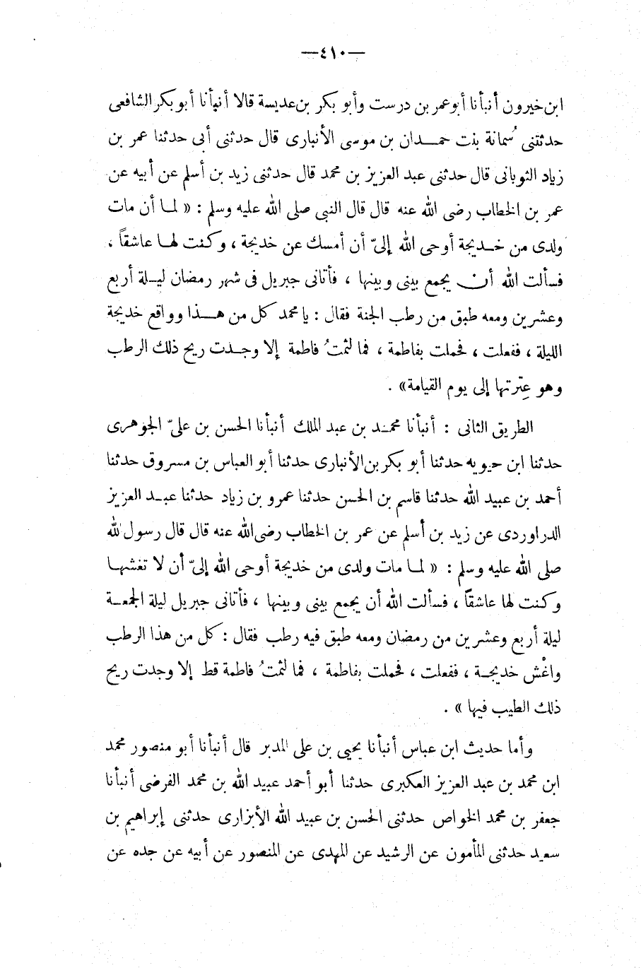 ابْن خَيْرُونٍ أَنْبَأَنَا أَبو عُمَرَ بْنُ دُرُسْتَ وَأَبُو بَكْرِ بْنُ عُدَيْسَةَ قَالا أَنْبَأَنَا أَبُو بَكْرٍ الشَّافِعِيُّ حَدَّثَنِي سِمانَةُ بِنْتُ حَمْدَانَ بْنِ مُوسَى الأَنْبَارِيُّ قَالَ حَدَّثَنِي أَبي حَدَّثَنَا عُمَرُ بُن زِيَادٍ الثَّوْبَانِيُّ قَالَ حَدَّثَنِي عَبْدُ الْعَزِيزِ بْنُ مُحَمَّدٍ قَالَ حَدَّثَنِي زَيْدُ بْنُ أَسْلَمَ عَنْ أَبِيهِ عَنْ عُمَرَ بن الْخطاب رَضِي الله عَنهُ قَالَ قَالَ النَّبِيُّ صَلَّى اللَّهُ عَلَيْهِ وَسَلَّمَ: " لَمَّا أَنْ مَاتَ وَلَدِي مِنْ خَدِيجَةَ أَوْحَى اللَّهُ إِلَيَّ أَنْ أُمْسِكَ عَنْ خَدِيجَةَ، وَكُنْتُ لَهَا عَاشِقًا، فَسَأَلْتُ اللَّهَ أَنْ يَجْمَعَ بَيْنِي وَبَيْنَهَا، فَأَتَانِي جِبْرِيلُ فِي شَهْرِ رَمَضَانَ لَيْلَةَ أَرْبَعٍ وَعِشْرِينَ وَمَعَهُ طَبَقٌ مِنْ رُطَبِ الْجَنَّةِ فَقَالَ: يَا مُحَمَّدُ كُلْ مِنْ هَذَا وَوَاقِعْ خَدِيجَةَ اللَّيْلَةَ، فَفَعَلْتُ، فَحَمَلَتْ بِفَاطِمَةَ، فَمَا لَثَمْتُ فَاطِمَةَ إِلا وَجَدْتُ رِيحَ ذَلِكَ الرُّطَبِ وَهُوَ عِتْرَتِهَا إِلَى يَوْمِ الْقِيَامَةِ ".