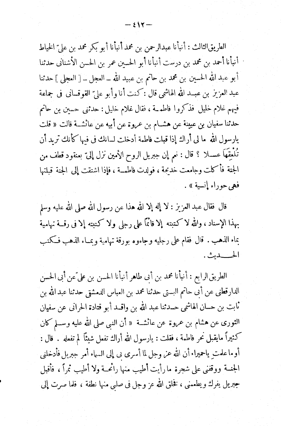 الطَّرِيق الثَّالِث: أَنبأَنَا عبد الرحمن بْنُ مُحَمَّدٍ أَنْبَأَنَا أَبُو بَكْرٍ مُحَمَّدُ بْنُ عَلِيٍّ الْخَيَّاطُ أَنْبَأَنَا أَحْمَدُ بْنُ مُحَمَّدِ بْنِ دُرُسْتَ أَنْبَأَنَا أَبُو الْحُسَيْنِ عُمَرُ بْنُ الْحَسَنِ الأُشْنَانِيُّ حَدَّثَنَا أَبُو عَبْدِ اللَّهِ الْحُسَيْنِ بْنِ مُحَمَّدِ بْنِ حَاتِم بن عبيد الله الْعجل [الْعِجْلِيُّ] حَدَّثَنَا عَبْدُ الْعَزِيزِ بْنُ عبد الله الْهَاشِمِيُّ قَالَ: كُنْتُ أَنَا وَأَبُو عَلِيٍّ الْقُوقَسَانِيُّ فِي جَمَاعَةٍ فِيهِمْ غُلامُ خَلِيلٍ فَذَكَرُوا فَاطِمَةَ، فَقَالَ غُلامُ خَلِيلٍ: حَدَّثَنِي حُسَيْنُ بْنُ حَاتِمٍ حَدَّثَنَا سُفْيَانُ بْنُ عُيَيْنَةَ عَنْ هِشَامِ بْنِ عُرْوَةَ عَنْ أَبِيهِ عَنْ عَائِشَةَ قَالَتْ " قُلْتُ يَا رَسُولَ اللَّهِ مَالِي أَرَاكَ إِذَا قَبَّلْتَ فَاطِمَةَ أَدْخَلْتَ لِسَانَكَ فِي فِيهَا كَأَنَّكَ تُرِيدُ أَنْ تُلْعِقَهَا عَسَلا؟ قَالَ: نَعَمْ إِنَّ جِبْرِيل الرّوح الامين نزل إى بِعُنْقُودٍ قُطِفَ مِنَ الْجَنَّةِ فَأَكَلْتُ وَجَامَعْتُ خَدِيجَةَ، فَوَلَدَتْ فَاطِمَةَ، فَإِذَا اشْتَقْتُ إِلَى الْجَنَّةِ قَبَّلْتَهَا فَهِيَ حَوْرَاءُ إِنْسِيَّةٌ ".