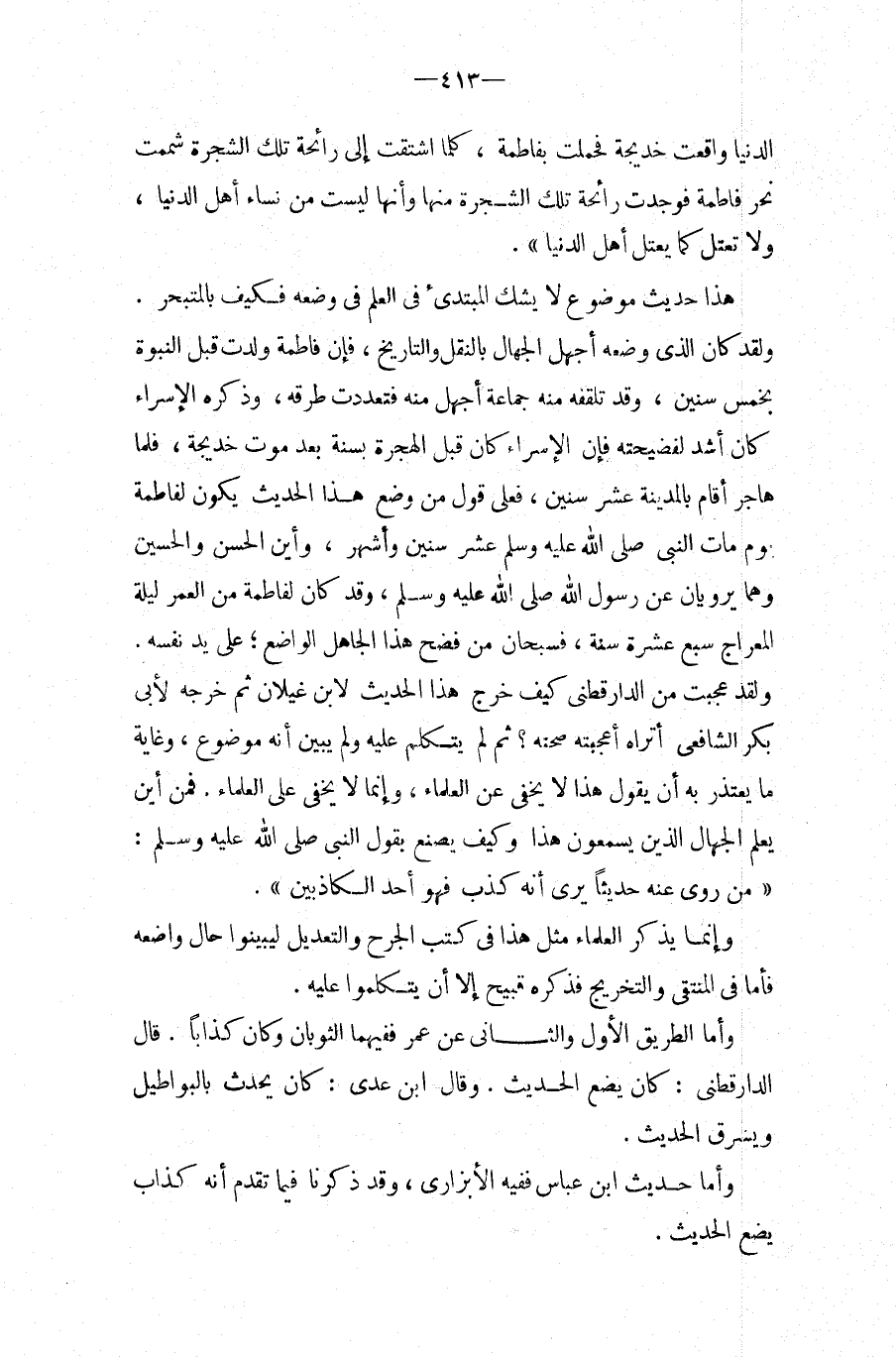 وَلَقَد كَانَ الَّذِي وَضعه أَجْهَل الْجُهَّال بِالنَّقْلِ والتاريخ، فَإِن فَاطِمَة ولدت قبل النُّبُوَّة بِخمْس سِنِين، وَقد تلقفه مِنْهُ جمَاعَة أَجْهَل مِنْهُ فتعددت طرقه، وَذكره الْإِسْرَاء كَانَ أَشد لفضيحته فَإِن الْإِسْرَاء كَانَ قبل الْهِجْرَة بِسنة بعد موت خَدِيجَة، فَلَمَّا هَاجر أَقَامَ بِالْمَدِينَةِ عشر سِنِين، فعلى قَول من وضع هَذَا الحَدِيث يكون لفاطمة يَوْم مَاتَ النَّبِي صَلَّى اللَّهُ عَلَيْهِ وَسَلَّمَ عشر سِنِين وَأشهر، وَأَيْنَ الْحسن وَالْحُسَيْن وهما يرويان عَنْ رَسُولِ اللَّهِ صَلَّى اللَّهُ عَلَيْهِ وَسَلَّمَ، وَقد كَانَ لفاطمة من الْعُمر لَيْلَة الْمِعْرَاج سبع عشرَة سنة، فسبحان من فَضَح هَذَا الْجَاهِل الْوَاضِع، على يَد نَفسه.