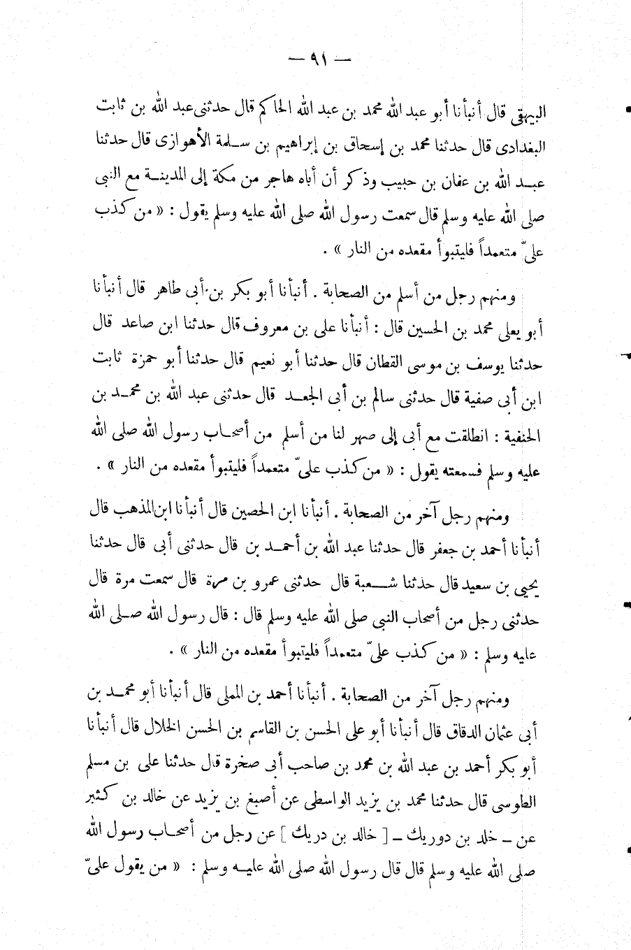 أَنْبَأَنَا ابْنُ الْحُصَيْنِ قَالَ أَنْبَأَنَا ابْنُ الْمُذْهِبِ قَالَ أْنَبَأَنَا أَحْمَدُ بن جَعْفَر قَالَ حَدثنَا عبد الله بن أَحْمد بن قَالَ حَدَّثَنِي أَبِي قَالَ حَدَّثَنَا يَحْيَى بْنُ سَعِيدٍ قَالَ حَدَّثَنَا شُعْبَةُ قَالَ حَدَّثَنِي عَمْرُو بْنُ مُرَّةَ قَالَ سَمِعْتُ مُرَّةَ قَالَ حَدَّثَنِي رَجُلٌ مِنْ أَصْحَابِ النَّبِيِّ صَلَّى اللَّهُ عَلَيْهِ وَسَلَّمَ قَالَ: قَالَ رَسُول الله صَلَّى اللَّهُ عَلَيْهِ وَسَلَّمَ: " مَنْ كَذَبَ عَلَيَّ مُتَعَمِّدًا فَلْيَتَبَوَّأْ مَقْعَدَهُ مِنَ النَّارِ ".