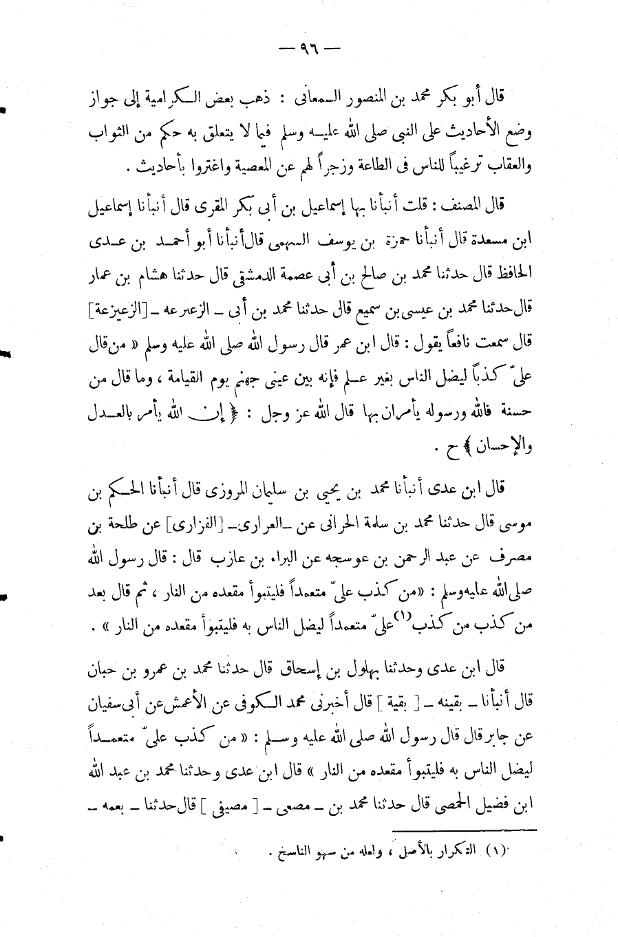 قَالَ ابْنُ عَدِيٍّ أَنْبَأَنَا مُحَمَّدُ بْنُ يَحْيَى بْنِ سُلَيْمَانَ الْمَرْوَزِيُّ قَالَ أَنْبَأَنَا الْحَكَمُ بْنُ مُوسَى قَالَ حَدَّثَنَا مُحَمَّدُ بْنُ سَلَمَةَ الْحَرَّانِيُّ عَن العرارى الْفَزَارِيِّ] عَنْ طَلْحَةَ بْنِ مُصَرِّفٍ عَن عبد الرحمن بْنِ عَوْسَجَةَ عَنِ الْبَرَاءِ عَنِ عَازِبٍ قَالَ: قَالَ رَسُولُ اللَّهِ صَلَّى اللَّهُ عَلَيْهِ وَسَلَّمَ: " من كَذَبَ عَلَيَّ مُتَعَمِّدًا فَلْيَتَبَوَّأْ مَقْعَدَهُ مِنَ النَّارِ، ثُمَّ قَالَ بَعْدُ مَنْ كَذَبَ مِنْ كَذَبٍ (1) عَلَيَّ مُتَعَمِّدًا لِيُضِلَّ النَّاسَ بِهِ فَلْيَتَبَوَّأْ مَقْعَدَهُ مِنَ النَّارِ ".