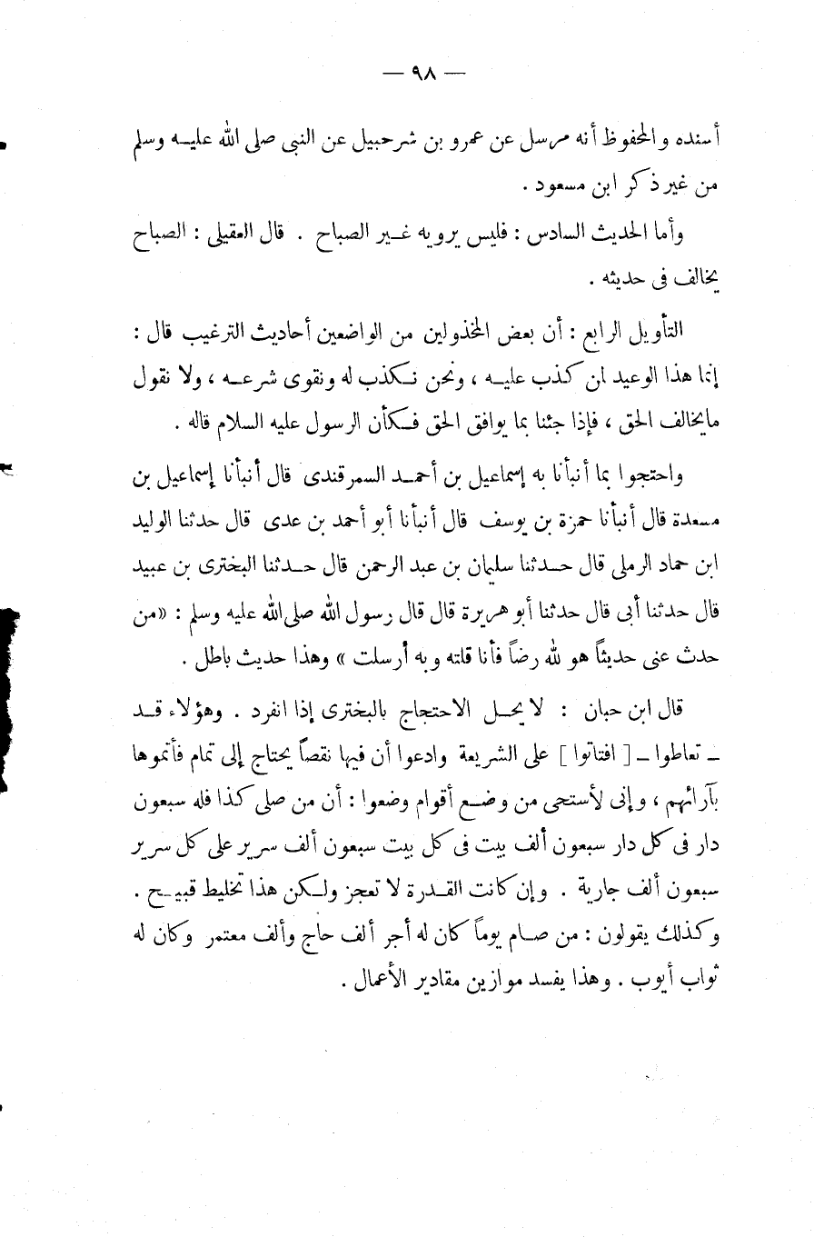 وَهَؤُلاءِ قَدْ تعاطوا [افْتَأَتُوا] عَلَى الشَّرِيعَةِ وَادَّعَوْا أَنَّ فِيهَا نَقْصًا يَحْتَاجُ إِلَى تَمَامٍ فَأَتَمُّوهَا بِآرَائِهِمْ، وَإِنِّي لأَسْتَحِي مِنْ وَضْعِ أَقْوَامٍ وَضَعُوا: أَنَّ مَنْ صلى كَذَا فَلهُ سَبْعُونَ دَار فِي كُلِّ دَارٍ سَبْعُونَ أَلْفَ بَيْتٍ فِي كُلِّ بَيْتٍ سَبْعُونَ أَلْفَ سَرِيرٍ عَلَى كُلِّ سَرِيرٍ سَبْعُونَ أَلْفَ جَارِيَةٍ.