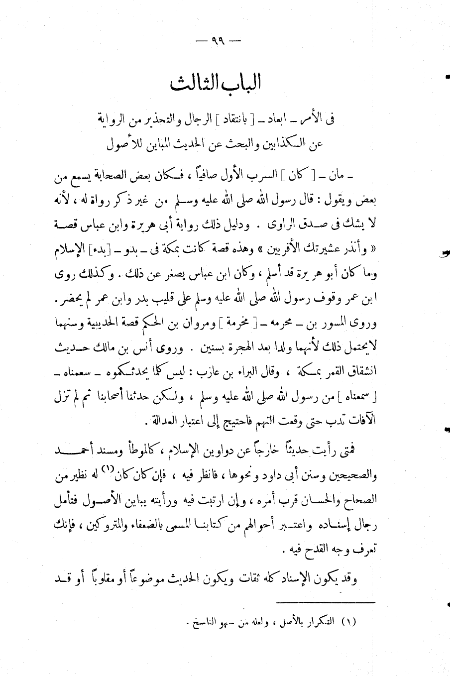 الْبَاب الثَّالِث فِي الْأَمر أبعاد [بانتقاد] الرِّجَال والتحذير من الرِّوَايَة عَن الْكَذَّابين والبحث عَن الحَدِيث المباين للاصول