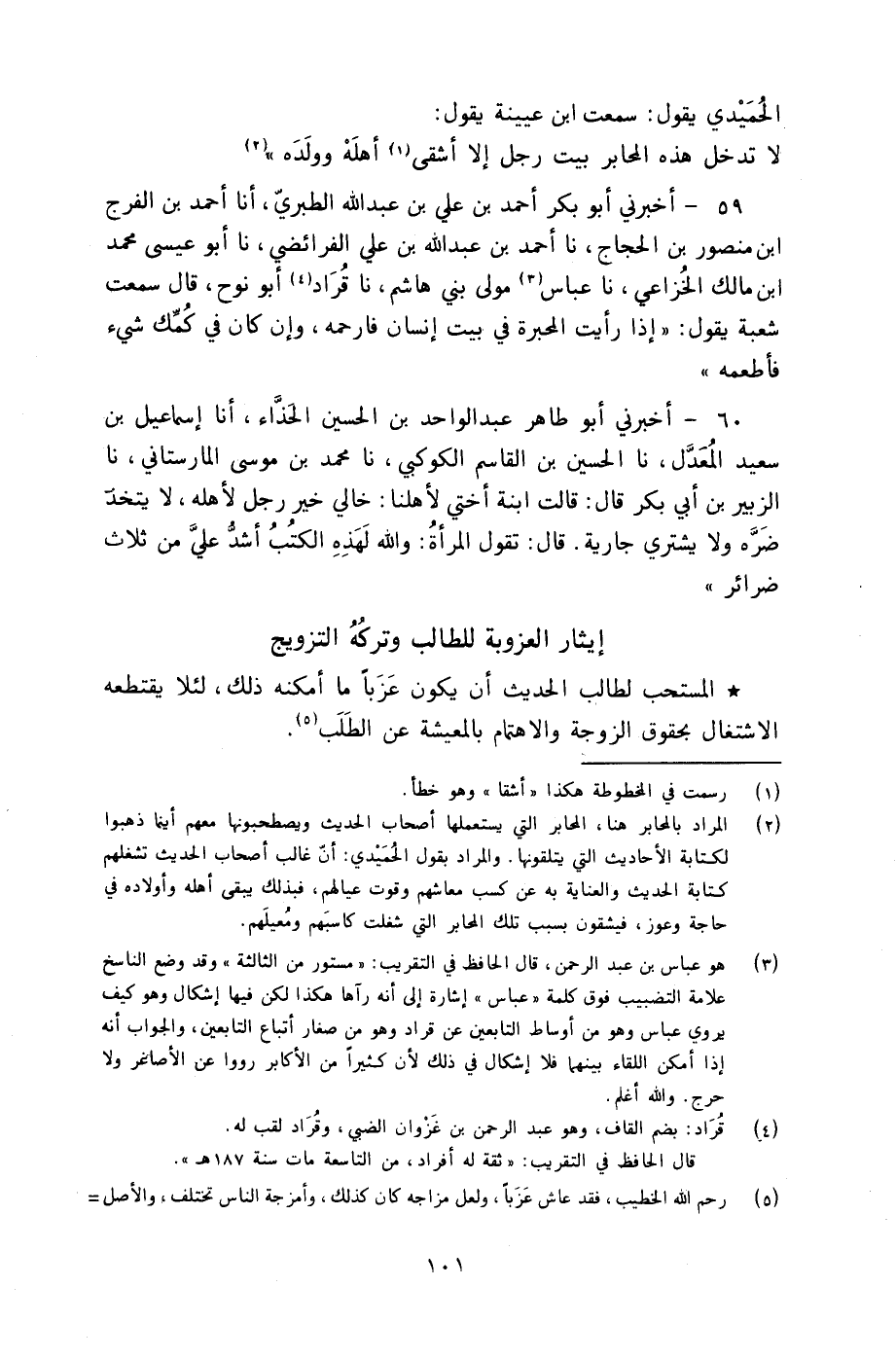 §إِيثَارُ الْعُزُوبَةِ لِلطَّالِبِ وَتَرْكُهُ التَّزْوِيجَ الْمُسْتَحَبُّ لِطَالِبِ الْحَدِيثِ أَنْ يَكُونَ عَزَبًا مَا أَمْكَنَهُ ذَلِكَ؛ لِئَلَّا يَقْتَطِعَهُ الِاشْتِغَالُ بِحُقُوقِ الزَّوْجَةِ وَالِاهْتِمَامِ بِالْمَعِيشَةِ عَنِ الطَّلَبِ