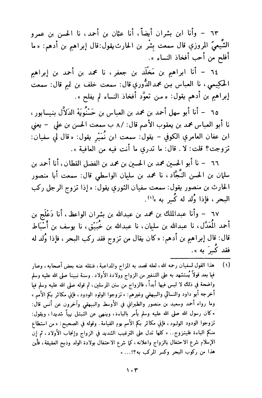 66 - نا أَبُو الْحُسَيْنِ مُحَمَّدُ بْنُ الْحُسَيْنِ بْنِ مُحَمَّدِ بْنِ الْفَضْلِ الْقَطَّانُ، أنا أَحْمَدُ بْنُ سَلْمَانَ بْنِ الْحَسَنِ النَّجَّادُ، نا مُحَمَّدُ بْنُ سُلَيْمَانَ الْوَاسِطِيُّ، قَالَ: سَمِعْتُ أَبَا مَنْصُورٍ الْحَارِثَ بْنَ مَنْصُورٍ، يَقُولُ: سَمِعْتُ سُفْيَانَ الثَّوْرِيَّ، يَقُولُ: «§إِذَا تَزَوَّجَ الرَّجُلُ رَكِبَ الْبَحْرَ، فَإِذَا وُلِدَ لَهُ كُسِرَ بِهِ»