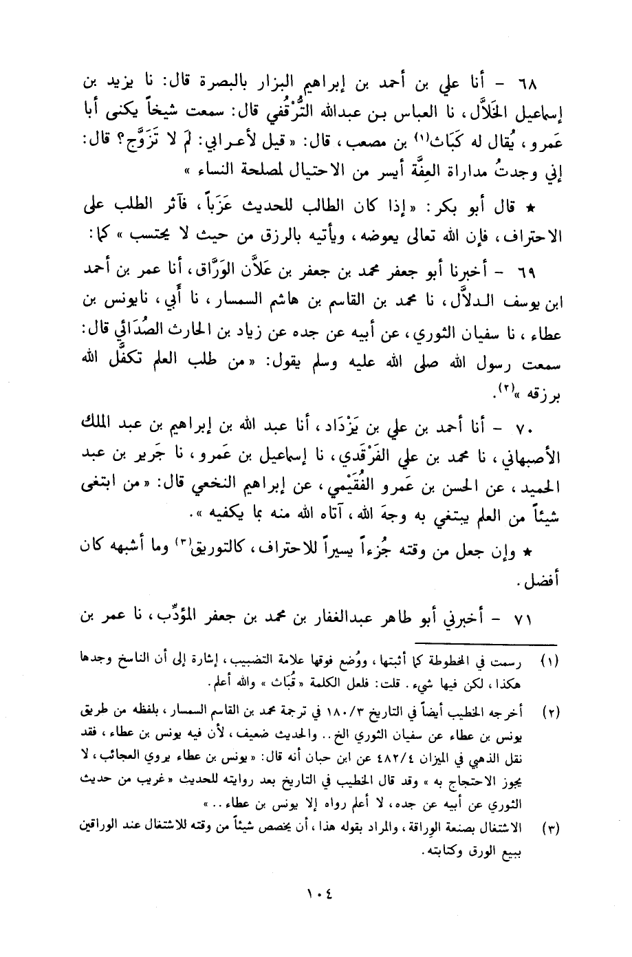 71 - أَخْبَرَنِي أَبُو طَاهِرٍ عَبْدُ الْغَفَّارِ بْنُ مُحَمَّدِ بْنِ جَعْفَرٍ الْمُؤَدِّبُ، نا عُمَرُ بْنُ أَحْمَدَ الْوَاعِظُ، نا عَبْدُ اللَّهِ بْنُ مُحَمَّدِ بْنِ عَبْدِ الْعَزِيزِ، نا أَبُو بَكْرٍ الْأَثْرَمُ، قَالَ: سَمِعْتُ أَحْمَدَ بْنَ حَنْبَلٍ، يَقُولُ: «§لَوْ كُنْتُ صَانِعًا صِنَاعَةً، كُنْتُ أُحِبُّ أَنْ أَكُونَ وَرَّاقًا» ، قُلْتُ: يَا أَبَا عَبْدِ اللَّهِ، أَيُّمَا أَحَبُّ إِلَيْكَ: نَكْتُبُ عَدَدَ حَدِيثٍ أَوْ عَدَدَ وَرِقٍ؟ فَقَالَ: عَدَدُ الْحَدِيثِ يَقَعُ الطَّوِيلُ وَالْقَصِيرُ، وَلَكِنْ يُكْتَبُ عَدَدُ وَرِقٍ وَيُواصَفُ عَلَيْهِ " مَعَ أَنَّ أَبَا عَبْدِ اللَّهِ مُحَمَّدَ بْنَ إِدْرِيسَ الشَّافِعِيَّ قَدْ قَالَ: «لَا يَصْلُحُ طَلَبُ الْعِلْمِ إِلَا لِمُفْلِسٍ»