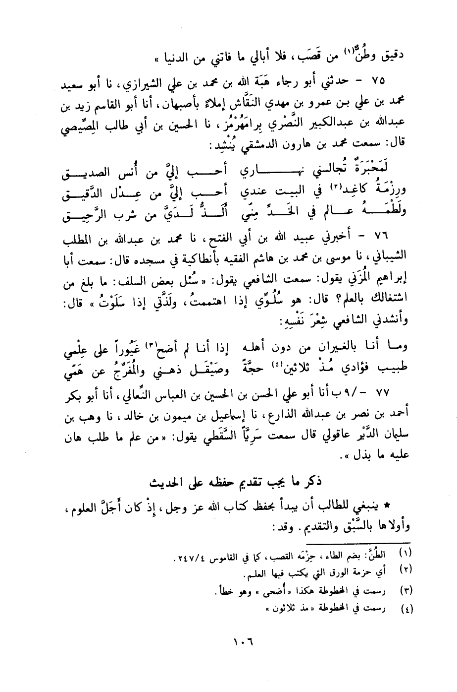 §ذِكْرُ مَا يَجِبُ تَقْدِيمُ حِفْظِهِ عَلَى الْحَدِيثِ يَنْبَغِي لِلطَّالِبِ أَنْ يَبْدَأَ بِحِفْظِ كِتَابِ اللَّهِ عَزَّ وَجَلَّ، إِذْ كَانَ أَجَلَّ الْعُلُومِ وَأَوْلَاهَا بِالسَّبْقِ وَالتَّقْدِيمِ