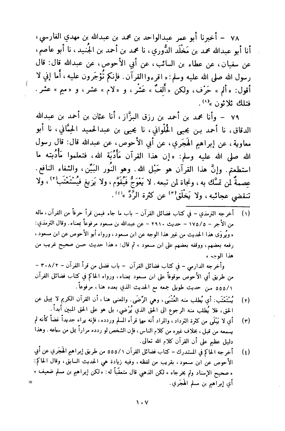 79 - وأنا مُحَمَّدُ بْنُ أَحْمَدَ بْنِ رِزْقٍ الْبَزَّازُ، أنا عُثْمَانُ بْنُ أَحْمَدَ بْنِ عَبْدِ اللَّهِ الدَّقَّاقُ، نا أَحْمَدُ بْنُ يَحْيَى الْحُلْوَانِيُّ، نا يَحْيَى بْنُ عَبْدِ الْحَمِيدِ الْحِمَّانِيُّ، نا أَبُو مُعَاوِيَةَ، عَنْ إِبْرَاهِيمَ الْهَجَرِيِّ، عَنْ أَبِي الْأَحْوَصِ، عَنْ عَبْدِ اللَّهِ، قَالَ: قَالَ رَسُولُ اللَّهِ صَلَّى اللهُ عَلَيْهِ وَسَلَّمَ: «إِنَّ §هَذَا الْقُرْآنَ مَأْدُبَةُ اللَّهِ، فَتَعَلَّمُوا مَأْدُبَتَهُ مَا اسْتَطَعْتُمْ، وَإِنَّ هَذَا الْقُرْآنَ هُوَ حَبْلُ اللَّهِ، وَهُوَ النُّورُ الْبَيِّنُ، وَالشِّفَاءُ النَّافِعُ، عِصْمَةٌ لِمَنْ تَمَسَّكَ بِهِ، وَنَجَاةٌ لِمَنْ تَبِعَهُ، لَا يَعْوَجُّ فَيُقَوَّمُ، وَلَا يَزِيغُ فَيُسْتَعْتَبُ، وَلَا تَنْقَضِي عَجَائِبُهُ، وَلَا يَخْلَقُ عَنْ كَثْرَةِ الرَّدِّ»
