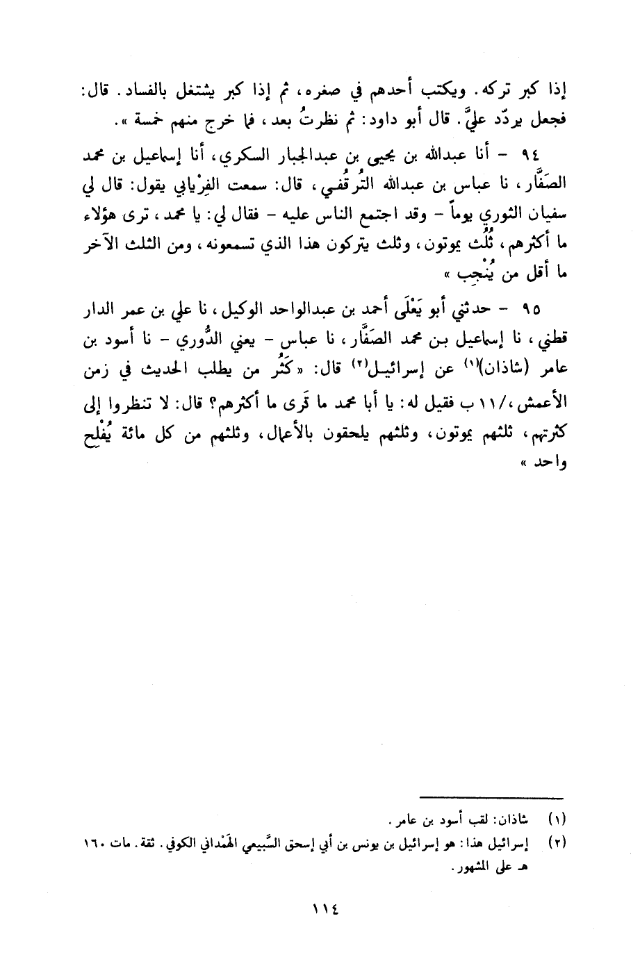95 - حَدَّثَنِي أَبُو يَعْلَى أَحْمَدُ بْنُ عَبْدِ الْوَاحِدِ الْوَكِيلُ، نا عَلِيُّ بْنُ عُمَرَ الدَّارَقُطْنِيُّ، نا إِسْمَاعِيلُ بْنُ مُحَمَّدٍ الصَّفَّارُ، نا عَبَّاسٌ، يَعْنِي الدُّورِيَّ نا أَسْوَدُ بْنُ عَامِرٍ شَاذَانَ، عَنْ إِسْرَائِيلَ، قَالَ: " كَثُرَ مَنْ يَطْلُبُ الْحَدِيثَ فِي زَمَنِ الْأَعْمَشِ، فَقِيلَ لَهُ: يَا أَبَا مُحَمَّدٍ، مَا تَرَى مَا أَكْثَرُهُمْ؟ قَالَ: «§لَا، تَنْظُرُوا إِلَى كَثْرَتِهِمْ، ثُلُثُهُمْ يَمُوتُونَ، وَثُلُثُهُمْ يَلْحَقُونَ بِالْأَعْمَالِ، وَثُلُثُهُمْ مِنْ كُلِّ مِائَةٍ يُفْلِحُ وَاحِدٌ»