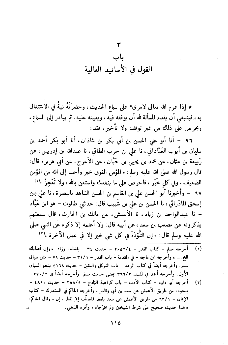 97 - وَأَخْبَرْنَا أَبُو الْحَسَنِ عَلِيُّ بْنُ الْقَاسِمِ بْنِ الْحَسَنِ الشَّاهِدُ بِالْبَصْرَةِ، نا عَلِيُّ بْنُ إِسْحَاقَ الْمَادَرَائيُّ، نا الْحَسَنُ بْنُ عَلِيِّ بْنِ شَبِيبٍ، قَالَ: حَدَّثَنِي طَالُوتُ هُوَ ابْنُ عَبَّادٍ، نا عَبْدُ الْوَاحِدِ بْنُ زِيَادٍ، نا الْأَعْمَشُ، عَنْ مَالِكِ بْنِ الْحَارِثِ، قَالَ: سَمِعْتَهُمْ يَذْكُرُونَهُ عَنْ مُصْعَبِ بْنِ سَعْدٍ، عَنْ أَبِيهِ، قَالَ: وَلَا أَعْلَمُهُ إِلَّا ذَكَرَهُ عَنِ النَّبِيِّ صَلَّى اللهُ عَلَيْهِ وَسَلَّمَ قَالَ: «§إِنَّ التُّؤَدَةَ فِي كُلِّ شَيْءٍ خَيْرٌ، إِلَّا فِي عَمِلِ الْآخِرَةِ» -[116]- وَيَعْمِدُ إِلَى أَسْنَدِ شُيُوخِ مِصْرِهِ وَأَقْدَمِهِمْ سَمَاعًا، فَيُدِيمُ الِاخْتِلَافَ إِلَيْهِ، وَيُوَاصِلُ الْعُكُوفَ عَلَيْهِ، وَمَذَاهِبُ النَّاسِ تَخْتَلِفُ فِي ذَلِكَ، فَمِنْهُمْ مَنْ يَكْتَفِي بِسَمَاعِ الْحَدِيثِ نَازِلًا مَعَ وُجُودِ مَنْ يَرْوِيهِ عَالِيًا، وَمِنْهُمْ مَنْ لَا يَقْتَنِعُ بِذَلِكَ، وَلَا يَقْتَصِرُ عَلَى النُّزُولِ وَهُوَ يَجِدُ الْعُلُوَّ، وَأَهْلُ النَّظَرِ أَيْضًا مُخْتَلِفُونَ فِي ذَلِكَ، فَمِنْهُمْ مَنْ يَرَى أَنَّ السَّمَاعَ النَّازِلَ أَفْضَلُ؛ لِأَنَّهُ يَجِبُ عَلَى الرَّاوِي أَنْ يَجْتَهِدَ فِي مَعْرِفَةِ جَرْحِ مَنْ يَرْوِي عَنْهُ وَتَعْدِيلِهِ، وَالِاجْتِهَادُ فِي أَحْوَالِ رُوَاةِ النَّازِلِ أَكْثَرُ، وَكَانَ الثَّوَابُ فِيهِ أَوْفَرَ، وَمِنْهُمْ مَا يَرَى أَنَّ سَمَاعَ الْعَالِي أَفْضَلُ لِأَنَّ الْمُجْتَهِدَ مُخَاطِرٌ وَسُقُوطُ بَعْضِ الْإِسْنَادِ مُسْقِطٌ لِبَعْضِ الِاجْتِهَادِ، وَذَلِكَ أَقْرَبُ إِلَى السَّلَامَةِ، فَكَانَ أَوْلَى، وَالَّذِي نَسْتَحِبُّهُ طَلَبُ الْعَالِي؛ إِذْ فِي الِاقْتِصَارِ عَلَى النَّازِلِ إِبْطَالُ الرِّحْلَةِ وَتَرْكُهَا، فَقَدْ رَحَلَ خَلْقٌ مِنْ أَهْلِ الْعِلْمِ قَدِيمًا وَحَدِيثًا إِلَى الْأَقْطَارِ الْبَعِيدَةِ، طَلَبًا لِعُلُوِّ الْإِسْنَادِ، وَلَعَلَّنَا نَذْكُرُ شَيْئًا مِنْ أَخْبَارِهِمْ فِي هَذَا الْكِتَابِ بَعْدُ إِذَا انْتَهَيْنَا إِلَى الْمَوْضِعِ الْمُقْتَضِي لِذِكْرِ ذَلِكَ إِنْ شَاءَ اللَّهُ