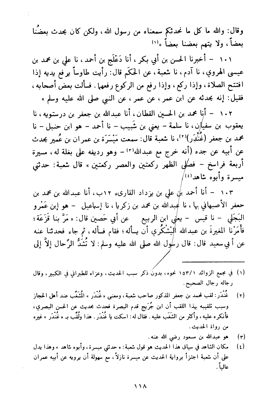 102 - أنا مُحَمَّدُ بْنُ الْحُسَيْنِ الْقَطَّانُ، أنا عَبْدُ اللَّهِ بْنُ جَعْفَرِ بْنِ دُرُسْتَوَيْهِ، نا يَعْقُوبُ بْنُ سُفْيَانَ، نا سَلَمَةُ، يَعْنِي ابْنَ شَبِيبٍ نا أَحْمَدُ هُوَ ابْنُ حَنْبَلٍ نا مُحَمَّدُ بْنُ جَعْفَرٍ، غُنْدَرٌ نا شُعْبَةُ، قَالَ: سَمِعْتُ مَيْسَرَةَ بْنَ عِمْرَانَ بْنِ عُمَيْرٍ، يُحَدِّثُ عَنْ أَبِيهِ، عَنْ جَدِّهِ، أَنَّهُ «خَرَجَ مَعَ عَبْدِ اللَّهِ - وَهُوَ رَدِيفُهُ عَلَى بَغْلَةٍ لَهُ مَسِيرَةَ أَرْبَعَةِ فَرَاسِخَ - §فَصَلَّى الظُّهْرَ رَكْعَتَيْنِ وَالْعَصْرَ رَكْعَتَيْنِ» ، قَالَ شُعْبَةُ: حَدَّثَنِي مَيْسَرَةُ وَأَبُوهُ شَاهِدٌ "