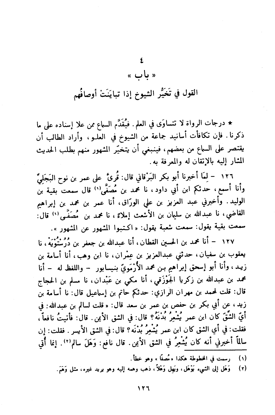126 - لِمَا أَخْبَرَنَا أَبُو بَكْرٍ الْبَرْقَانِيُّ، قَالَ: قُرِئَ عَلَى عُمَرَ بْنِ نُوحٍ الْبَجَلِيِّ وَأَنَا أَسْمَعُ، حَدَّثَكُمُ ابْنُ أَبِي دَاوُدَ، نا مُحَمَّدُ بْنُ مُصَفَّى، قَالَ: سَمِعْتُ بَقِيَّةَ بْنَ الْوَلِيدِ، وَأَخْبَرَنِي عَبْدُ الْعَزِيزِ بْنُ عَلِيٍّ الْوَرَّاقُ، أنا عُمَرُ بْنُ مُحَمَّدِ بْنِ إِبْرَاهِيمَ الْقَاضِي، نا عَبْدُ اللَّهِ بْنُ سُلَيْمَانَ بْنِ الْأَشْعَثِ، إِمْلَاءً، نا مُحَمَّدُ بْنُ مُصَفَّى، قَالَ: سَمِعْتُ بَقِيَّةَ، يَقُولُ: سَمِعْتُ شُعْبَةَ، يَقُولُ: §«اكْتُبُوا الْمَشْهُورَ عَنِ الْمَشْهُورِ»