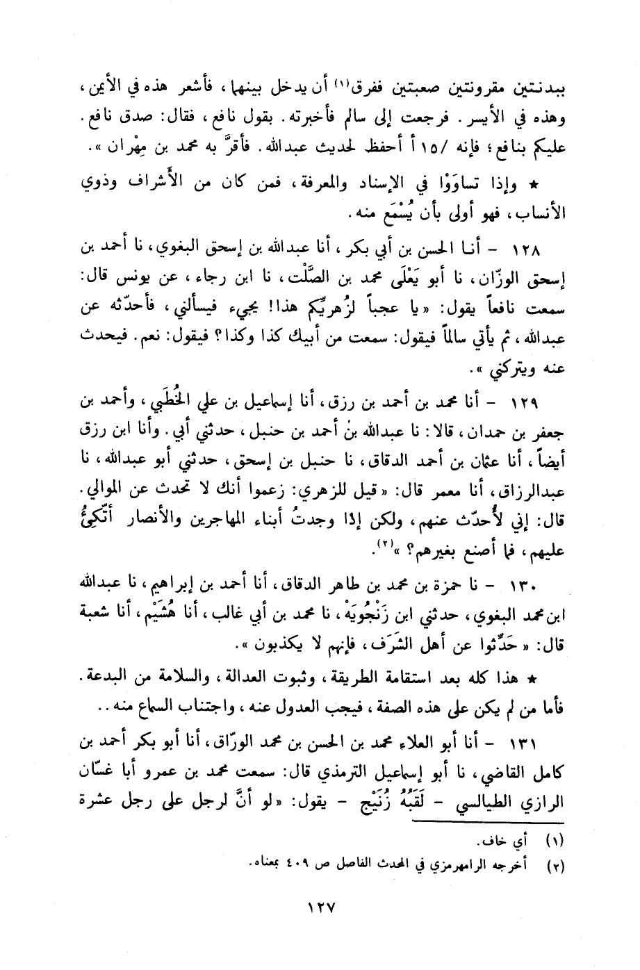 129 - أنا مُحَمَّدُ بْنُ أَحْمَدَ بْنِ رِزْقٍ، أنا إِسْمَاعِيلُ بْنُ عَلِيٍّ الْخُطَبِيُّ، وَأَحْمَدُ بْنُ جَعْفَرِ بْنِ حَمْدَانَ، قَالَا: نا عَبْدُ اللَّهِ بْنُ أَحْمَدَ بْنِ حَنْبَلٍ، حَدَّثَنِي أَبِي، وأنا ابْنُ رِزْقٍ، أَيْضًا، أنا عُثْمَانُ بْنُ أَحْمَدَ الدَّقَّاقُ، نا حَنْبَلُ بْنُ إِسْحَاقَ، حَدَّثَنِي أَبُو عَبْدِ اللَّهِ، نا عَبْدُ الرَّزَّاقِ، أنا مَعْمَرٌ، قَالَ: " §قِيلَ لِلزُّهْرِيِّ: زَعَمُوا أَنَّكَ لَا تُحَدِّثُ عَنِ الْمَوَالِي، قَالَ: إِنِّي لَأُحَدِّثُ عَنْهُمْ، وَلَكِنْ إِذَا وَجَدْتُ أَبْنَاءَ الْمُهَاجِرِينَ وَالْأَنْصَارِ أَتَّكِئُ عَلَيْهِمْ فَمَا أَصْنَعُ بِغَيْرِهِمْ "