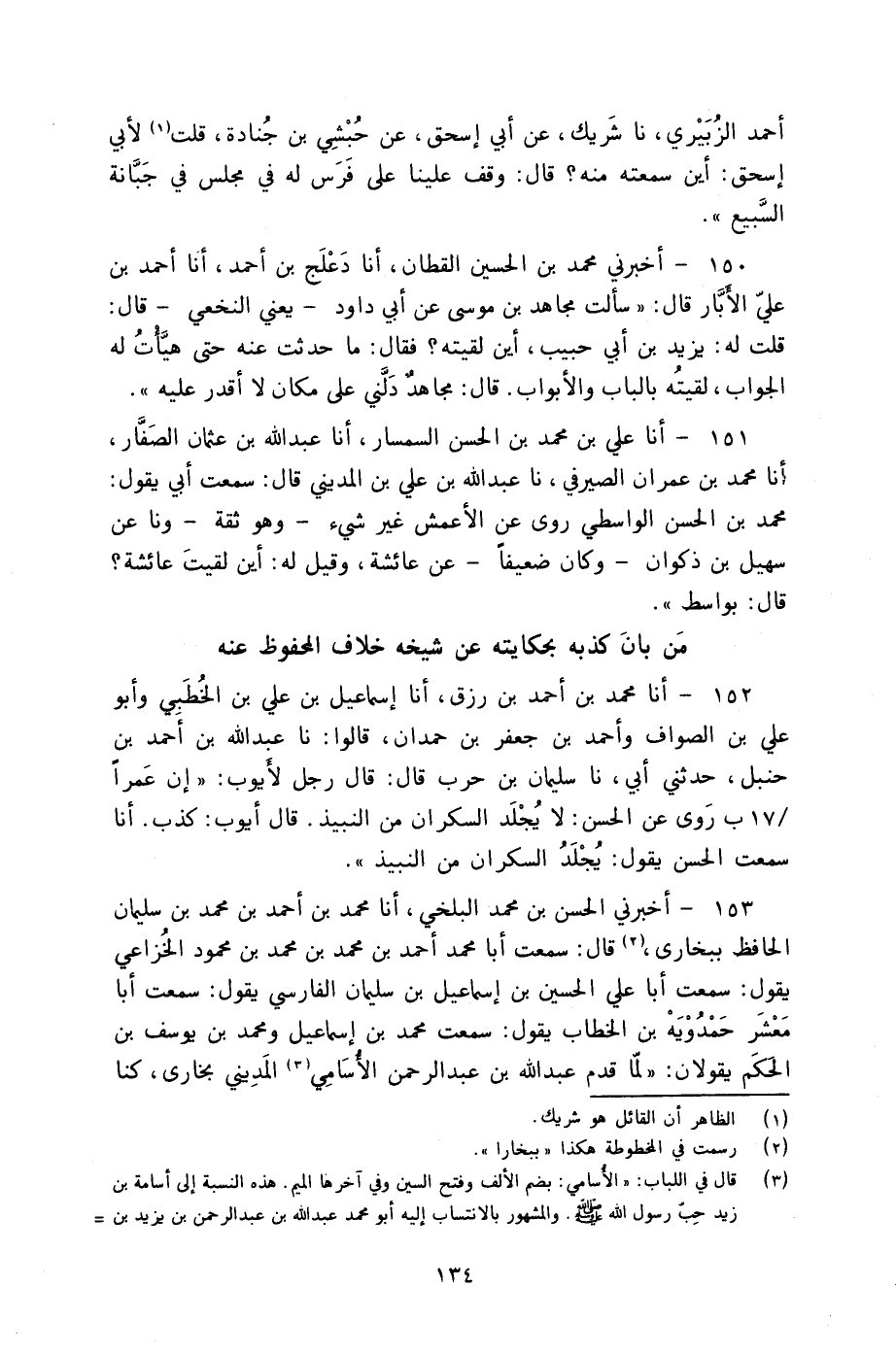 153 - أَخْبَرَنِي الْحَسَنُ بْنُ مُحَمَّدٍ الْبَلْخِيُّ، أنا مُحَمَّدُ بْنُ أَحْمَدَ بْنِ مُحَمَّدِ بْنِ سُلَيْمَانَ الْحَافِظُ، بِبُخَارَى قَالَ: سَمِعْتُ أَبَا مُحَمَّدٍ أَحْمَدَ بْنَ مُحَمَّدِ بْنِ مُحَمَّدِ بْنِ مَحْمُودٍ الْخُزَاعِيَّ يَقُولُ: سَمِعْتُ أَبَا عَلِيٍّ الْحُسَيْنَ بْنَ إِسْمَاعِيلَ بْنِ سُلَيْمَانَ الْفَارِسِيَّ، يَقُولُ: سَمِعْتُ أَبَا مَعْشَرٍ حَمْدَوَيْهِ بْنَ الْخَطَّابِ يَقُولُ: سَمِعْتُ مُحَمَّدَ بْنَ إِسْمَاعِيلَ، وَمُحَمَّدَ بْنَ يُوسُفَ بْنِ الْحَكَمِ، يَقُولَانِ: §" لَمَّا قَدِمَ عَبْدُ اللَّهِ بْنُ عَبْدِ الرَّحْمَنِ الْأُسَامِيُّ الْمَدِينِيُّ بُخَارَى كُنَّا -[135]- نَخْتَلِفُ إِلَيْهِ وَهُوَ يُحَدِّثُنَا: فَحَدَّثَنَا يَوْمًا بِحَدِيثٍ عَنِ النَّبِيِّ صَلَّى اللهُ عَلَيْهِ وَسَلَّمَ: أَنَّهُ كَانَ يَحْتَجِمُ يَوْمَ السَّبْتِ، ثُمَّ قَالَ: رَأَيْتُ سُفْيَانَ بْنَ عُيَيْنَةَ يَحْتَجِمُ يَوْمَ السَّبْتِ غَيْرَ مَرَّةٍ، قَالَ مُحَمَّدُ بْنُ يُوسُفَ: فَأَتَيْنَا أَبَا جَعْفَرٍ الْمُسْنَدِيُّ، فَذَكَرْنَا لَهُ ذَلِكَ، فَقَالَ: أَقِيمُونِي أَقِيمُونِي، سَمِعْتُ سُفْيَانَ بْنَ عُيَيْنَةَ يَقُولُ: مَا احْتَجَمْتُ قَطُّ إِلَّا مَرَّةً وَاحِدَةً، فَغُشِيَ عَلَيَّ، قَالَ: فَعَلِمْنَا حِينَئِذٍ أَنَّهُ كَذَّابٌ "، قَالَ أَبُو مَعْشَرٍ: فَلِذَلِكَ كَذَّبُوهُ، كَانَ يَأْخُذُ كِتَابَ الْقَعْنَبِيِّ وَكِتَابَ قُتَيْبَةَ فَيَنْظُرُ فِيهِ فَيَرْوِي لَهُمْ عَنِ اللَّيْثِ بْنِ سَعْدٍ وَغَيْرِهِ أَوْ كَمَا قَالَ " قَالَ أَبُو بَكْرٍ الْخَطِيبُ: وَإِذَا سَلِمَ الرَّاوِي مِنْ وَضْعِ الْحَدِيثِ وَادِّعَاءِ السَّمَاعِ مِمَّنْ لَمْ يَلْقَهُ، وَجَانَبَ الْأَفْعَالَ الَّتِي تَسْقُطُ بِهَا الْعَدَالَةُ، غَيْرَ أَنَّهُ لَمْ يَكُنْ لَهُ كِتَابٌ بِمَا سَمِعَهُ فَحَدَّثَ مِنْ حِفْظِهِ، لَمْ يَصِحَّ الِاحْتِجَاجُ بِحَدِيثِهِ حَتَّى يَشْهَدَ لَهُ أَهْلُ الْعِلْمِ بِالْأَثَرِ وَالْعَارِفُونَ بِهِ أَنَّهُ مِمَّنْ قَدْ طَلَبَ الْحَدِيثَ وَعَانَاهُ وَضَبَطَهُ وَحَفِظَهُ، وَيُعْتَبَرُ إِتْقَانُهُ وَضَبْطُهُ بِقَلْبِ الْأَحَادِيثِ عَلَيْهِ