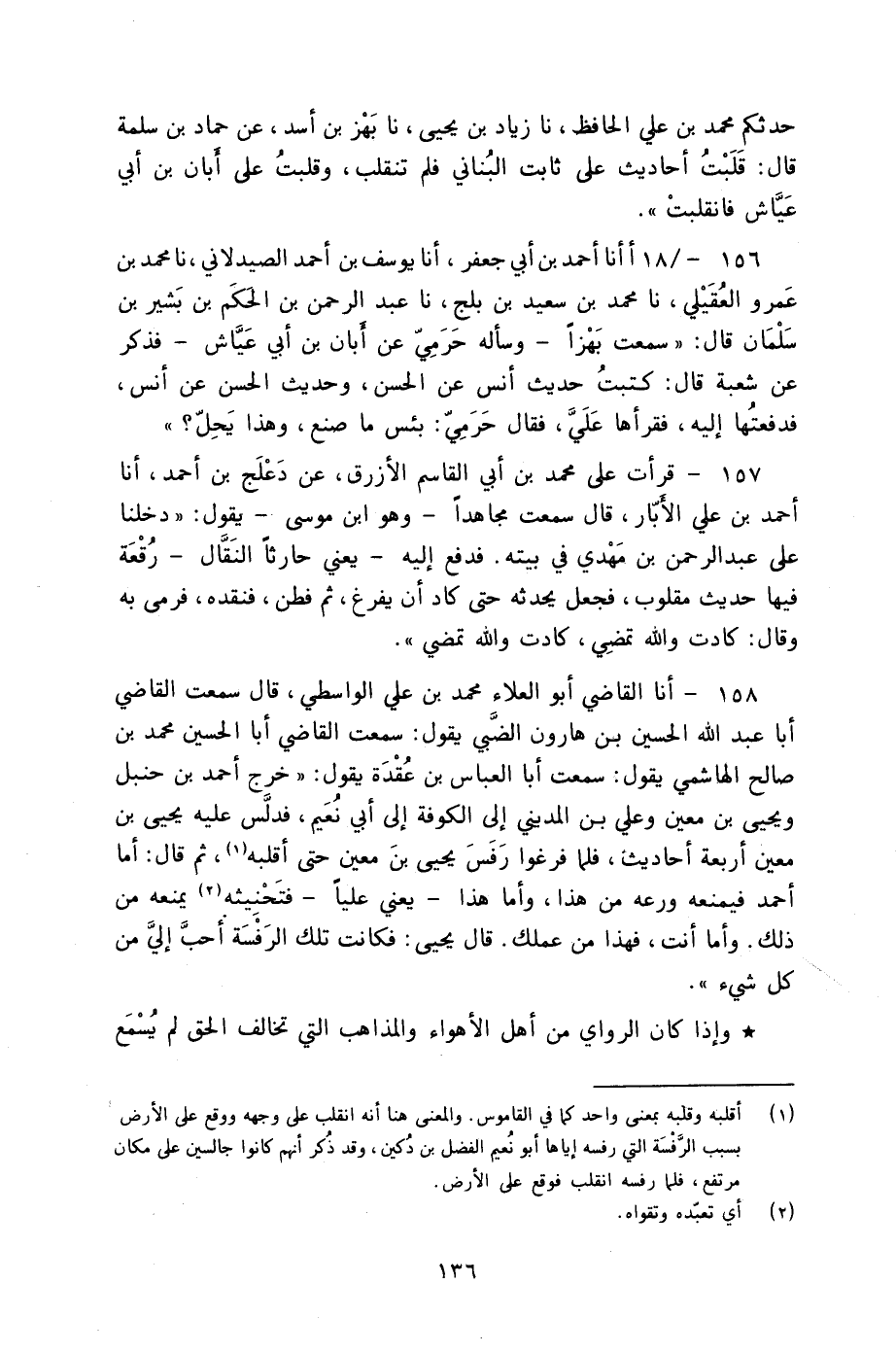 158 - أنا الْقَاضِي أَبُو الْعَلَاءِ مُحَمَّدُ بْنُ عَلِيٍّ الْوَاسِطِيُّ قَالَ: سَمِعْتُ الْقَاضِيَ أَبَا عَبْدِ اللَّهِ الْحُسَيْنُ بْنُ هَارُونَ الضَّبِّيُّ، يَقُولُ: سَمِعْتُ الْقَاضِيَ أَبَا الْحُسَيْنِ مُحَمَّدَ بْنَ صَالِحٍ الْهَاشِمِيَّ، يَقُولُ: سَمِعْتُ أَبَا الْعَبَّاسِ بْنَ عُقْدَةَ، يَقُولُ: " §خَرَجَ أَحْمَدُ بْنُ حَنْبَلٍ، وَيَحْيَى بْنُ مَعِينٍ، وَعَلِيُّ بْنُ الْمَدِينِيِّ إِلَى الْكُوفَةِ إِلَى أَبِي نُعَيْمٍ، فَدَلَّسَ عَلَيْهِ يَحْيَى بْنُ مَعِينٍ أَرْبَعَةَ أَحَادِيثَ، فَلَمَّا فَرَغُوا رَفَسَ يَحْيَى بْنَ مَعِينٍ حَتَّى أَقْلَبَهُ، ثُمَّ قَالَ: " أَمَّا أَحْمَدُ فَيَمْنَعُهُ وَرَعُهُ مِنْ هَذَا، وَأَمَّا هَذَا - يَعْنِي عَلِيًّا - فَتَحْنِيثُهُ يَمْنَعُهُ مِنْ ذَلِكَ، وَأَمَّا أَنْتَ فَهَذَا مِنْ عَمَلِكَ، قَالَ يَحْيَى: فَكَانَتْ تِلْكَ الرَّفْسَةُ أَحَبَّ إِلَيَّ مِنْ كُلِّ شَيْءٍ " وَإِذَا كَانَ الرَّاوِي مِنْ أَهْلِ الْأَهْوَاءِ وَالْمَذَاهِبِ الَّتِي تُخَالِفُ الْحَقَّ لَمْ يُسْمَعْ مِنْهُ، وَإِنْ عُرِفَ بِالطَّلَبِ وَالْحِفْظِ
