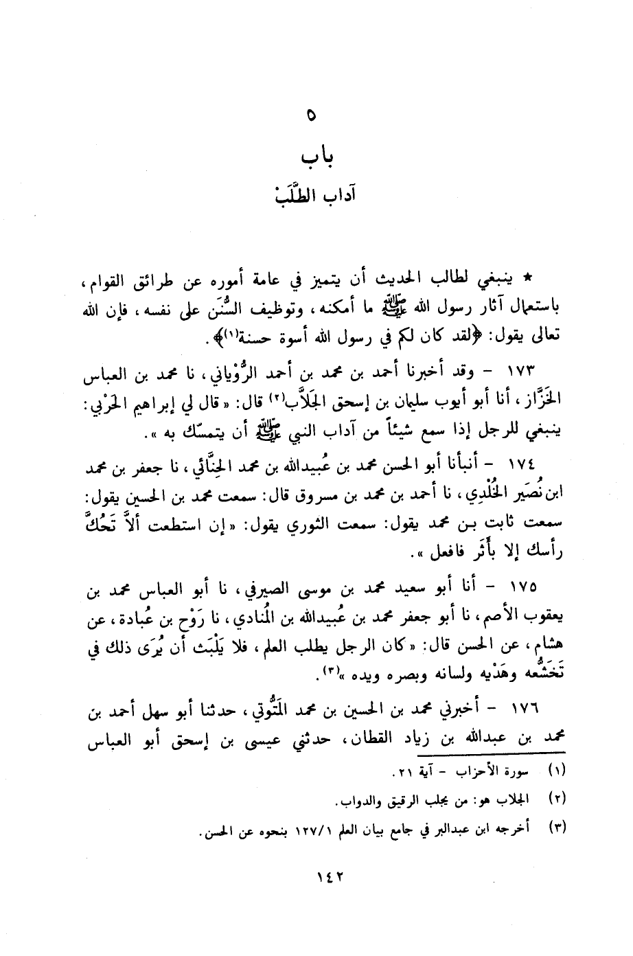 §بَابُ آدَابِ الطَّلَبِ يَنْبَغِي لِطَالِبِ الْحَدِيثِ أَنْ يَتَمَيَّزَ فِي عَامَّةِ أُمُورِهِ عَنْ طَرَائِقِ الْقَوَّامِ، بِاسْتِعْمَالِ آثَارِ رَسُولِ اللَّهِ صَلَّى اللهُ عَلَيْهِ وَسَلَّمَ مَا أَمْكَنَهُ، وَتَوْظِيفِ السُّنَنِ عَلَى نَفْسِهِ، فَإِنَّ اللَّهَ تَعَالَى يَقُولُ: {لَقَدْ كَانَ لَكُمْ فِي رَسُولِ اللَّهِ أُسْوَةٌ حَسَنَةٌ} [الأحزاب: 21]