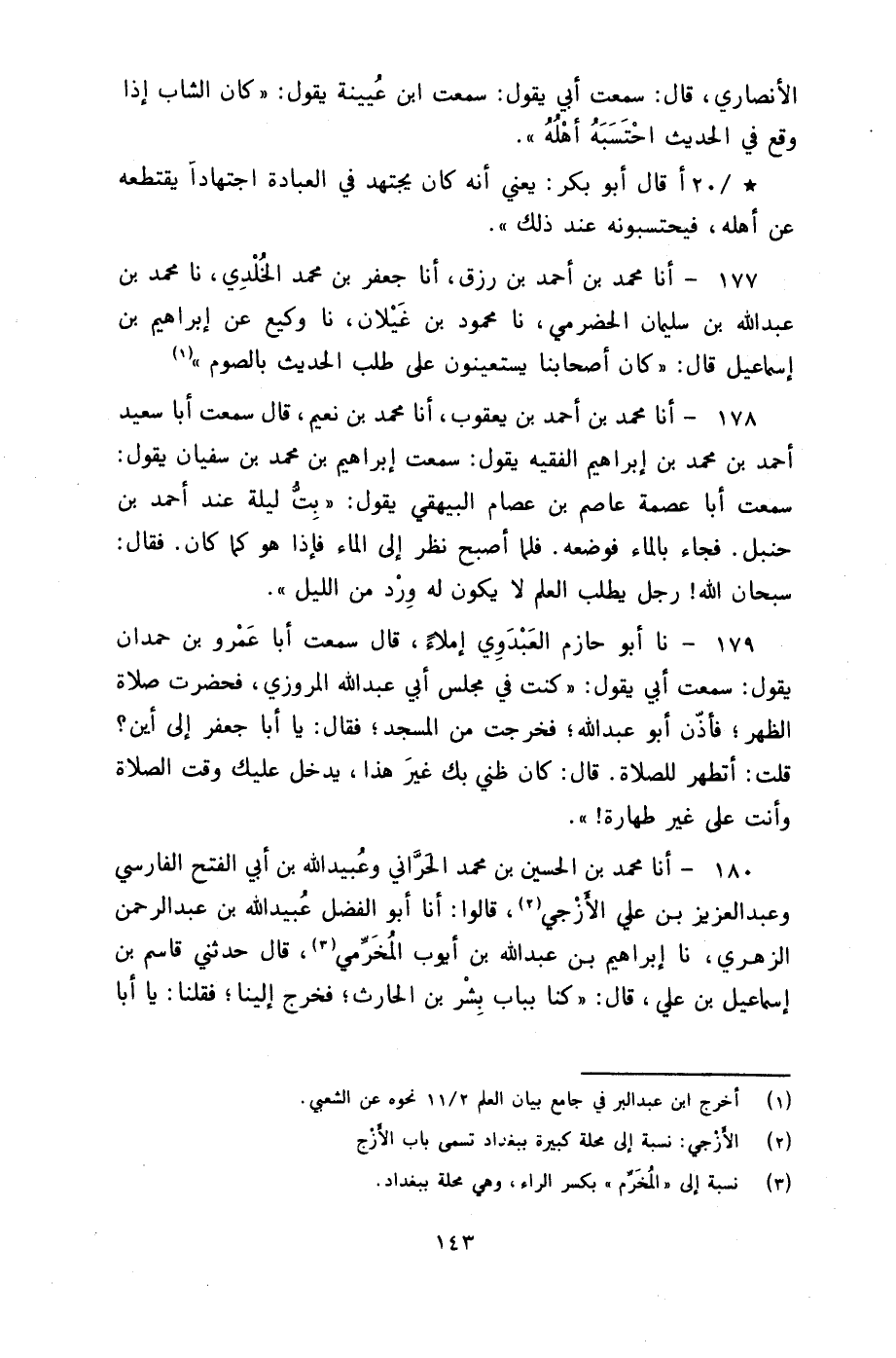 180 - أنا مُحَمَّدُ بْنُ الْحُسَيْنِ بْنِ مُحَمَّدٍ الْحَرَّانِيُّ، وَعُبَيْدُ اللَّهِ بْنُ أَبِي الْفَتْحِ الْفَارِسِيُّ، وَعَبْدُ الْعَزِيزِ بْنُ عَلِيٍّ الْأَزَجِيُّ، قَالُوا: أنا أَبُو الْفَضْلِ عُبَيْدُ اللَّهِ بْنُ عَبْدِ الرَّحْمَنِ الزُّهْرِيُّ، نا إِبْرَاهِيمُ بْنُ عَبْدِ اللَّهِ بْنِ أَيُّوبَ الْمُخَرِّمِيُّ، قَالَ: حَدَّثَنِي قَاسِمُ بْنُ إِسْمَاعِيلَ بْنِ عَلِيٍّ، قَالَ: كُنَّا بِبَابِ بِشْرِ بْنِ الْحَارِثِ فَخَرَجَ إِلَيْنَا فَقُلْنَا: يَا أَبَا نَصْرٍ، حَدِّثْنَا، فَقَالَ: " §أَتُؤَدُّونَ زَكَاةَ الْحَدِيثِ؟ قَالَ: قُلْتُ لَهُ: يَا أَبَا نَصْرٍ، وَلِلْحَدِيثِ زَكَاةٌ؟ قَالَ: نَعَمْ، إِذَا سَمِعْتُمُ الْحَدِيثَ فَمَا كَانَ فِي ذَلِكَ مِنْ عَمَلٍ أَوْ صَلَاةٍ أَوْ تَسْبِيحٍ اسْتَعْمَلْتُمُوهُ "