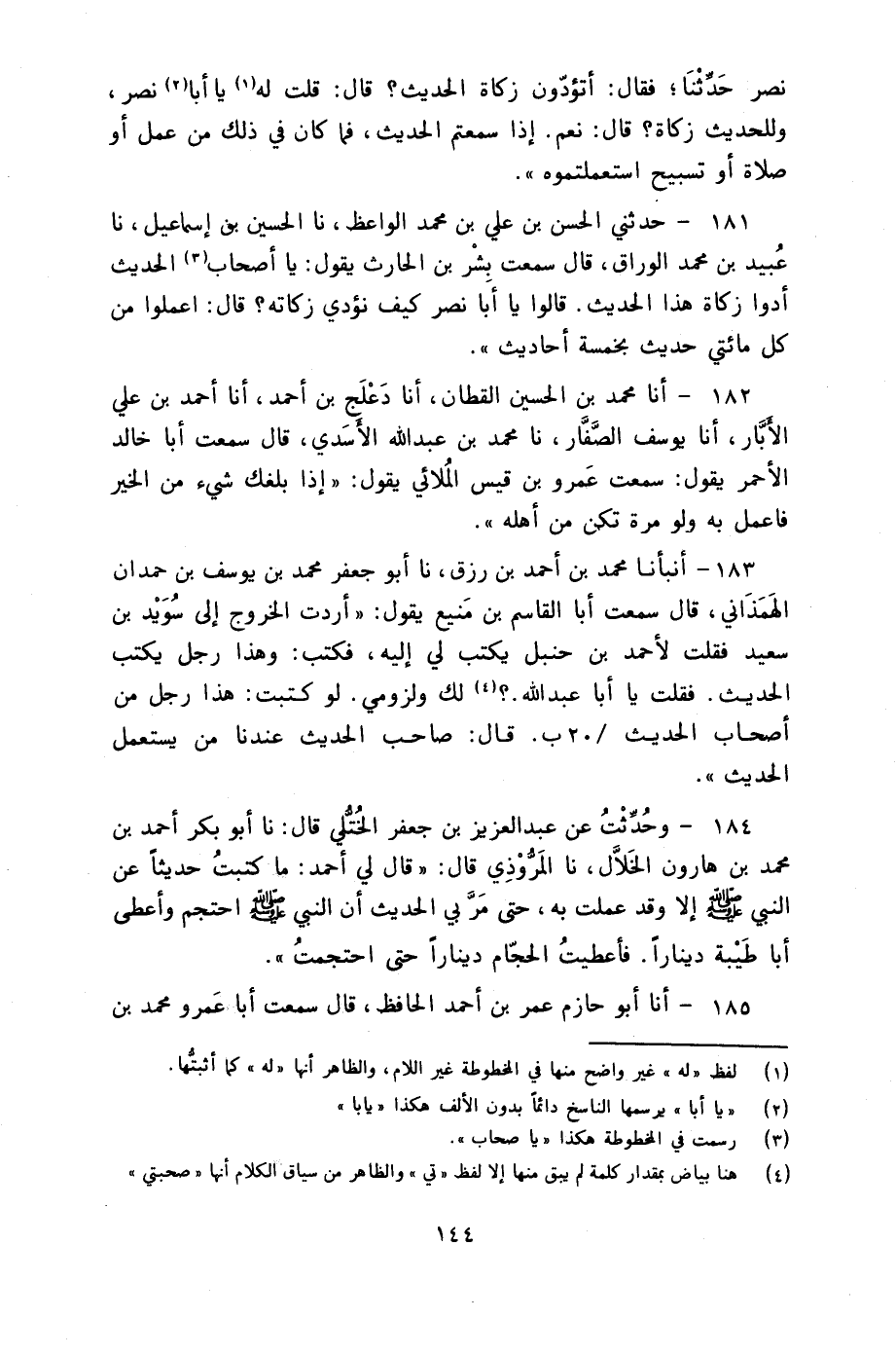 181 - حَدَّثَنِي الْحَسَنُ بْنُ عَلِيِّ بْنِ مُحَمَّدٍ الْوَاعِظُ، نا الْحُسَيْنُ بْنُ إِسْمَاعِيلَ، نا عُبَيْدُ بْنُ مُحَمَّدٍ الْوَرَّاقُ، قَالَ: سَمِعْتُ بِشْرَ بْنَ الْحَارِثِ، يَقُولُ: " §يَا أَصْحَابَ الْحَدِيثِ، أَدُّوا زَكَاةَ هَذَا الْحَدِيثِ، قَالُوا: يَا أَبَا نَصْرٍ، كَيْفَ نُؤَدِّي زَكَاتَهُ؟ قَالَ: «اعْمَلُوا مِنْ كُلِّ مِائَتَيْ حَدِيثٍ بِخَمْسَةِ أَحَادِيثَ»