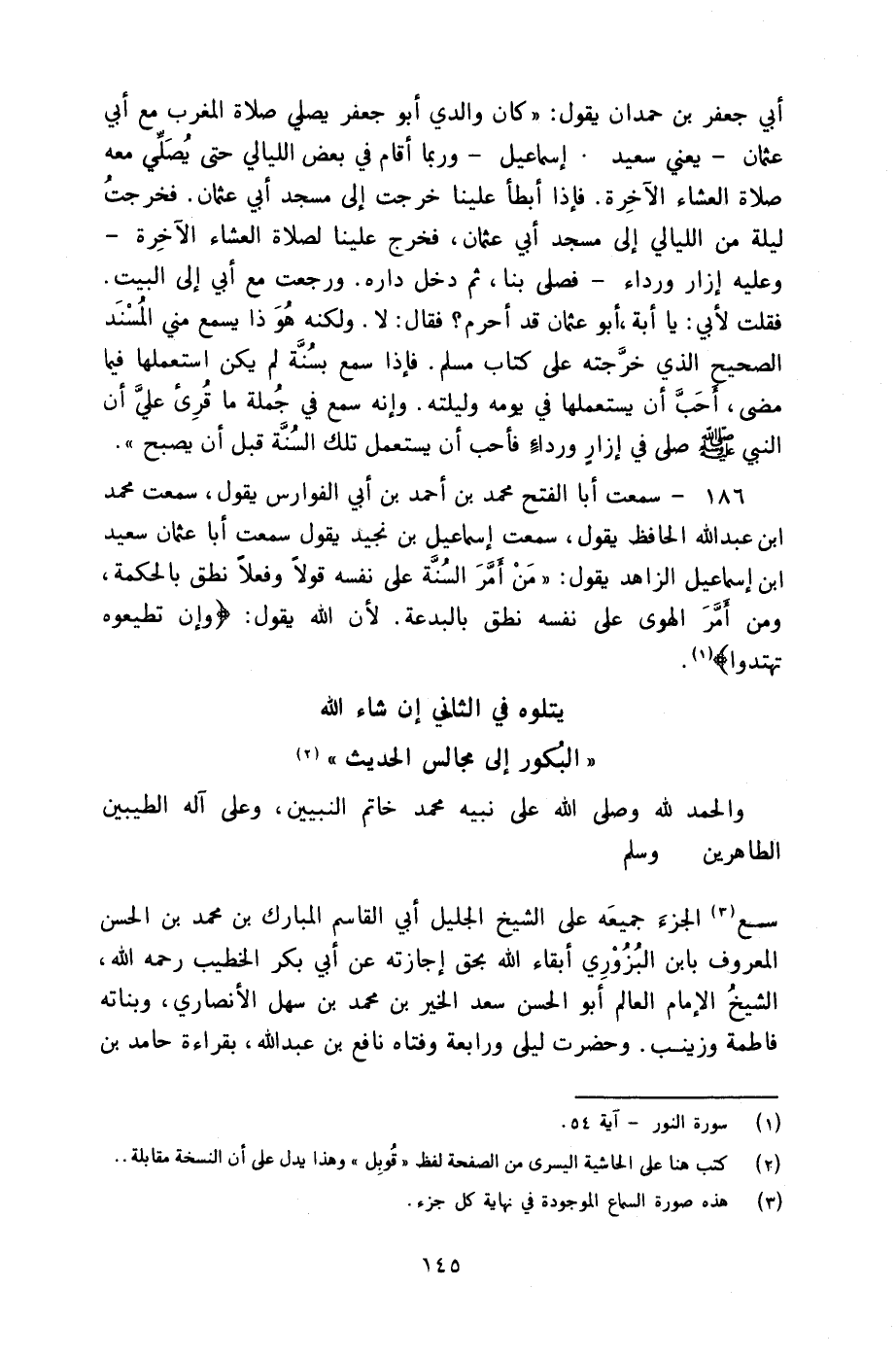 186 - سَمِعْتُ أَبَا الْفَتْحِ مُحَمَّدَ بْنَ أَحْمَدَ بْنِ أَبِي الْفَوَارِسِ يَقُولُ: سَمِعْتُ مُحَمَّدَ بْنَ عَبْدِ اللَّهِ الْحَافِظَ، يَقُولُ: سَمِعْتُ إِسْمَاعِيلَ بْنَ نُجَيْدٍ، يَقُولُ: سَمِعْتُ أَبَا عُثْمَانَ سَعِيدُ بْنُ إِسْمَاعِيلَ الزَّاهِدُ يَقُولُ: " §مَنْ أَمَّرَ السُّنَّةَ عَلَى نَفْسِهِ قَوْلًا وَفِعْلًا نَطَقَ بِالْحِكْمَةِ، وَمَنْ أَمَّرَ الْهَوَى عَلَى نَفْسِهِ نَطَقَ بِالْبِدْعَةِ، لِأَنَّ اللَّهَ يَقُولُ {وَإِنْ تُطِيعُوهُ تَهْتَدُوا} [النور: 54] "