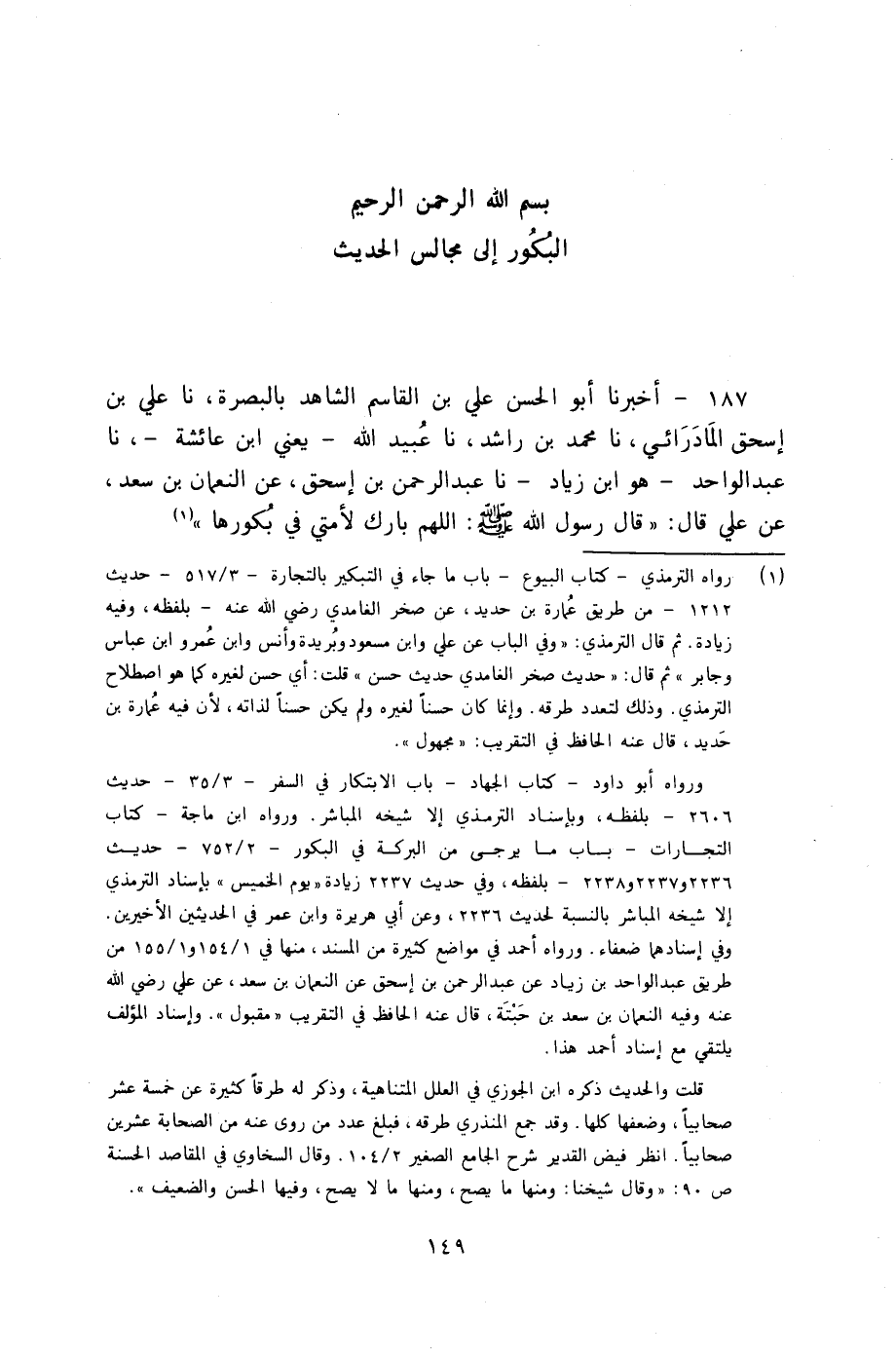 187 - أَخْبَرَنَا أَبُو الْحَسَنِ عَلِيُّ بْنُ الْقَاسِمِ الشَّاهِدُ بِالْبَصْرَةِ، نا عَلِيُّ بْنُ إِسْحَاقَ الْمَادَرَائِيُّ، نا مُحَمَّدُ بْنُ رَاشِدٍ، نا عُبَيْدُ اللَّهِ يَعْنِي ابْنَ عَائِشَةَ، نا عَبْدُ الْوَاحِدِ هُوَ ابْنُ زِيَادٍ، نا عَبْدُ الرَّحْمَنِ بْنُ إِسْحَاقَ، عَنِ النُّعْمَانِ بْنِ سَعْدٍ، عَنْ عَلِيٍّ، قَالَ: قَالَ رَسُولُ اللَّهِ صَلَّى اللهُ عَلَيْهِ وَسَلَّمَ: §«اللَّهُمَّ بَارِكْ لِأُمَّتِي فِي بُكُورِهَا»
