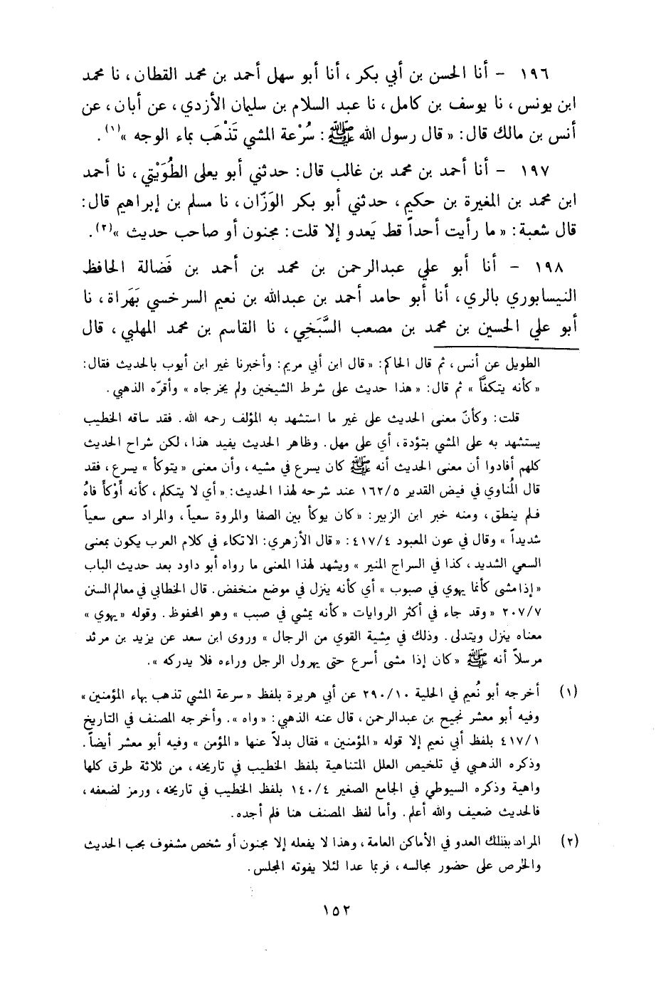 196 - أنا الْحَسَنُ بْنُ أَبِي بَكْرٍ أنا أَبُو سَهْلٍ أَحْمَدُ بْنُ مُحَمَّدٍ الْقَطَّانُ، نا مُحَمَّدُ بْنُ يُونُسَ، نا يُوسُفُ بْنُ كَامِلٍ، نا عَبْدُ السَّلَامِ بْنُ سُلَيْمَانَ الْأَزْدِيُّ، عَنْ أَبَانَ، عَنْ أَنَسِ بْنِ مَالِكٍ، قَالَ: قَالَ رَسُولُ اللَّهِ صَلَّى اللهُ عَلَيْهِ وَسَلَّمَ: §«سُرْعَةُ الْمَشْيِ تَذْهَبُ بِمَاءِ الْوَجْهِ»