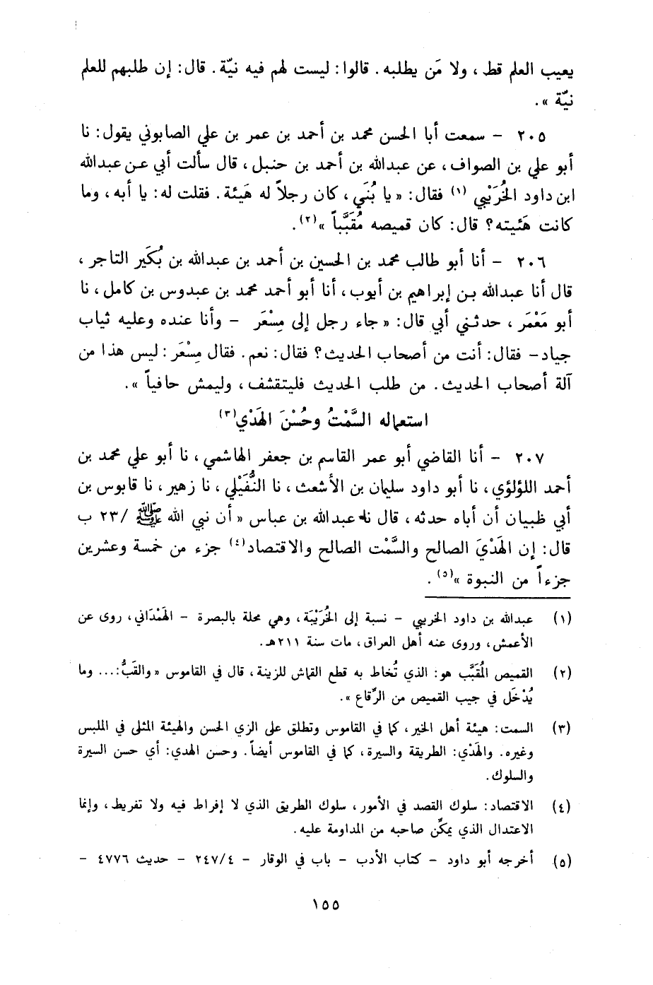 206 - أنا أَبُو طَالِبٍ مُحَمَّدُ بْنُ الْحُسَيْنِ بْنِ أَحْمَدَ بْنِ عَبْدِ اللَّهِ بْنِ بُكَيْرٍ التَّاجِرُ، قَالَ: أنا عَبْدُ اللَّهِ بْنُ إِبْرَاهِيمَ بْنِ أَيُّوبَ، أنا أَبُو أَحْمَدَ مُحَمَّدُ بْنُ عَبْدُوسِ بْنِ كَامِلٍ، نا أَبُو مَعْمَرٍ، حَدَّثَنِي أَبِي قَالَ: جَاءَ رَجُلٌ إِلَى مِسْعَرٍ وَأَنَا عِنْدَهُ، وَعَلَيْهِ، ثِيَابٌ جِيَادٌ، فَقَالَ: أَنْتَ مِنْ أَصْحَابِ الْحَدِيثِ؟ فَقَالَ: نَعَمْ، فَقَالَ مِسْعَرٌ: «§لَيْسَ هَذَا مِنْ آلَةِ أَصْحَابِ الْحَدِيثِ، مَنْ طَلَبَ الْحَدِيثَ فَلْيَتَقَشَّفْ، وَلْيَمْشِ حَافِيًا»