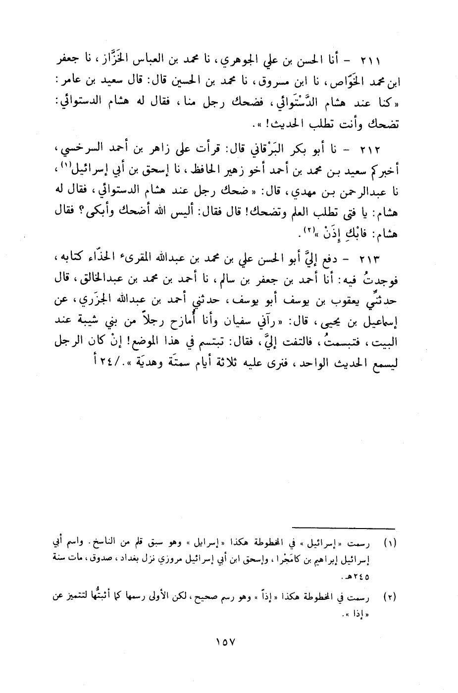 211 - أنا الْحَسَنُ بْنُ عَلِيٍّ الْجَوْهَرِيُّ، نا مُحَمَّدُ بْنُ الْعَبَّاسِ الْخَزَّازُ، نا جَعْفَرُ بْنُ مُحَمَّدٍ الْخَوَّاصُ، نا ابْنُ مَسْرُوقٍ، نا مُحَمَّدُ بْنُ الْحُسَيْنِ، قَالَ: قَالَ سَعِيدُ بْنُ عَامِرٍ: " كُنَّا عِنْدَ هِشَامٍ الدَّسْتُوَائِيِّ فَضَحِكَ رَجُلٌ مِنَّا فَقَالَ لَهُ هِشَامٌ الدَّسْتُوَائِيُّ: §«تَضْحَكُ وَأَنْتَ تَطْلُبُ الْحَدِيثَ»