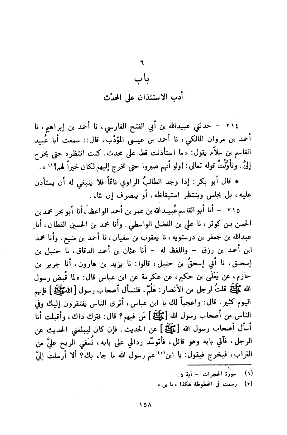 214 - حَدَّثَنِي عُبَيْدُ اللَّهِ بْنُ أَبِي الْفَتْحِ الْفَارِسِيُّ، نا أَحْمَدُ بْنُ إِبْرَاهِيمَ، نا أَحْمَدُ بْنُ مَرْوَانَ الْمَالِكِيُّ، نا أَحْمَدُ بْنُ عِيسَى الْمُؤَدِّبُ، قَالَ: سَمِعْتُ أَبَا عُبَيْدٍ الْقَاسِمَ بْنَ سَلَّامٍ، يَقُولُ: " §مَا اسْتَأْذَنْتُ قَطُّ عَلَى مُحَدِّثٍ، كُنْتُ أَنْتَظِرُهُ حَتَّى يَخْرُجَ إِلَيَّ، وَتَأَوَّلْتُ قَوْلَهُ تَعَالَى: {وَلَوْ أَنَّهُمْ صَبَرُوا حَتَّى تَخْرُجَ إِلَيْهِمْ لَكَانَ خَيْرًا لَهُمْ} [الحجرات: 5] " قَالَ أَبُو بَكْرٍ: إِذَا وَجَدَ الطَّالِبُ الرَّاوِيَ نَائِمًا، فَلَا يَنْبَغِي لَهُ أَنْ يَسْتَأْذِنَ عَلَيْهِ، بَلْ يَجْلِسُ وَيَنْتَظِرُ اسْتِيقَاظَهُ، أَوْ يَنْصَرِفُ إِنْ شَاءَ