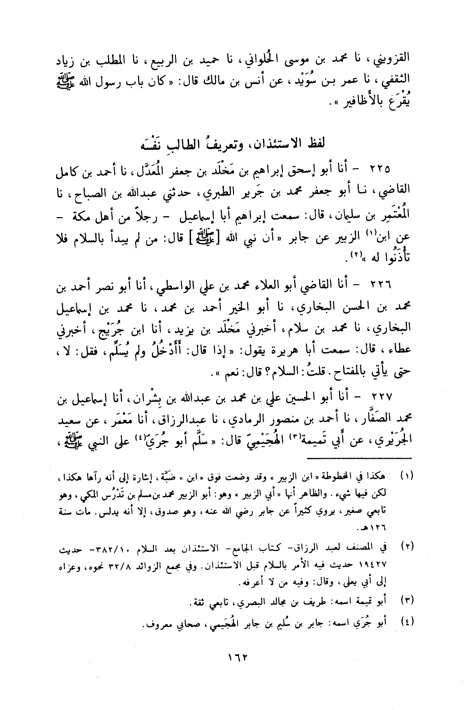 أنا أَبُو إِسْحَاقَ إِبْرَاهِيمُ بْنُ مَخْلَدِ بْنِ جَعْفَرٍ الْمُعَدَّلُ، نا أَحْمَدُ بْنُ كَامِلٍ الْقَاضِي، نا أَبُو جَعْفَرٍ مُحَمَّدُ بْنُ جَرِيرٍ الطَّبَرِيُّ، حَدَّثَنِي عَبْدُ اللَّهِ بْنُ الصَّبَّاحِ، نا الْمُعْتَمِرُ بْنُ سُلَيْمَانَ، قَالَ: سَمِعْتُ إِبْرَاهِيمَ أَبَا إِسْمَاعِيلَ، رَجُلًا مِنْ أَهْلِ مَكَّةَ، عَنِ ابْنِ الزُّبَيْرِ، عَنْ جَابِرٍ، أَنَّ نَبِيَّ اللَّهِ صَلَّى اللهُ عَلَيْهِ وَسَلَّمَ قَالَ: §«مَنْ لَمْ يَبْدَأْ بِالسَّلَامِ فَلَا تَأْذَنُوا لَهُ»