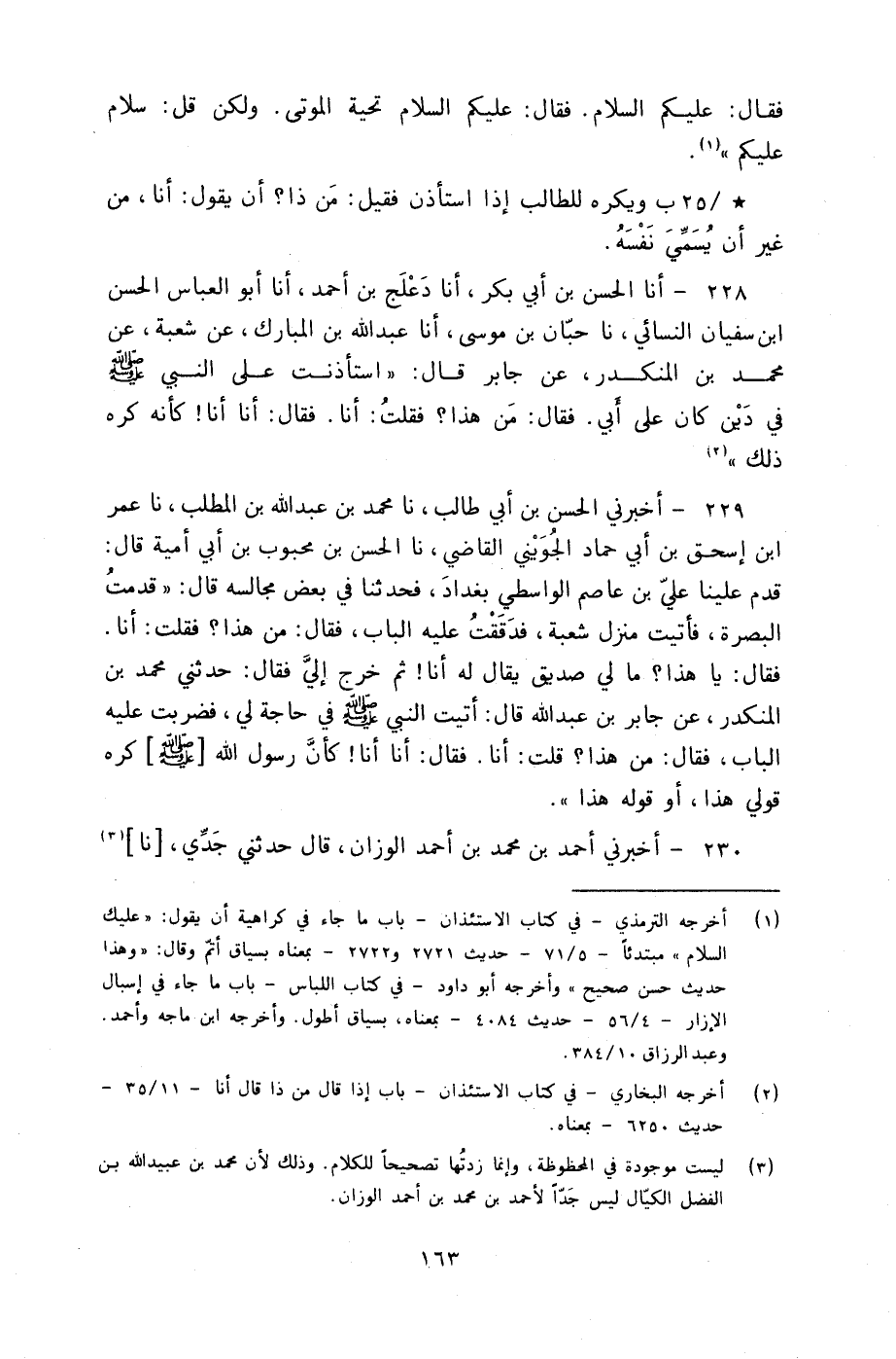 228 - أنا الْحَسَنُ بْنُ أَبِي بَكْرٍ أنا دَعْلَجُ بْنُ أَحْمَدَ، أنا أَبُو الْعَبَّاسِ الْحَسَنُ بْنُ سُفْيَانَ النَّسَائِيُّ، نا حِبَّانُ بْنُ مُوسَى، أنا عَبْدُ اللَّهِ بْنُ الْمُبَارَكِ، عَنْ شُعْبَةَ، عَنْ مُحَمَّدِ بْنِ الْمُنْكَدِرِ، عَنْ جَابِرٍ، قَالَ: اسْتَأْذَنْتُ عَلَى النَّبِيِّ صَلَّى اللهُ عَلَيْهِ وَسَلَّمَ فِي دَيْنٍ كَانَ عَلَى أَبِي، فَقَالَ: «مَنْ هَذَا؟» فَقُلْتُ: أَنَا، فَقَالَ: §«أَنَا أَنَا» كَأَنَّهُ كَرِهَ ذَلِكَ "