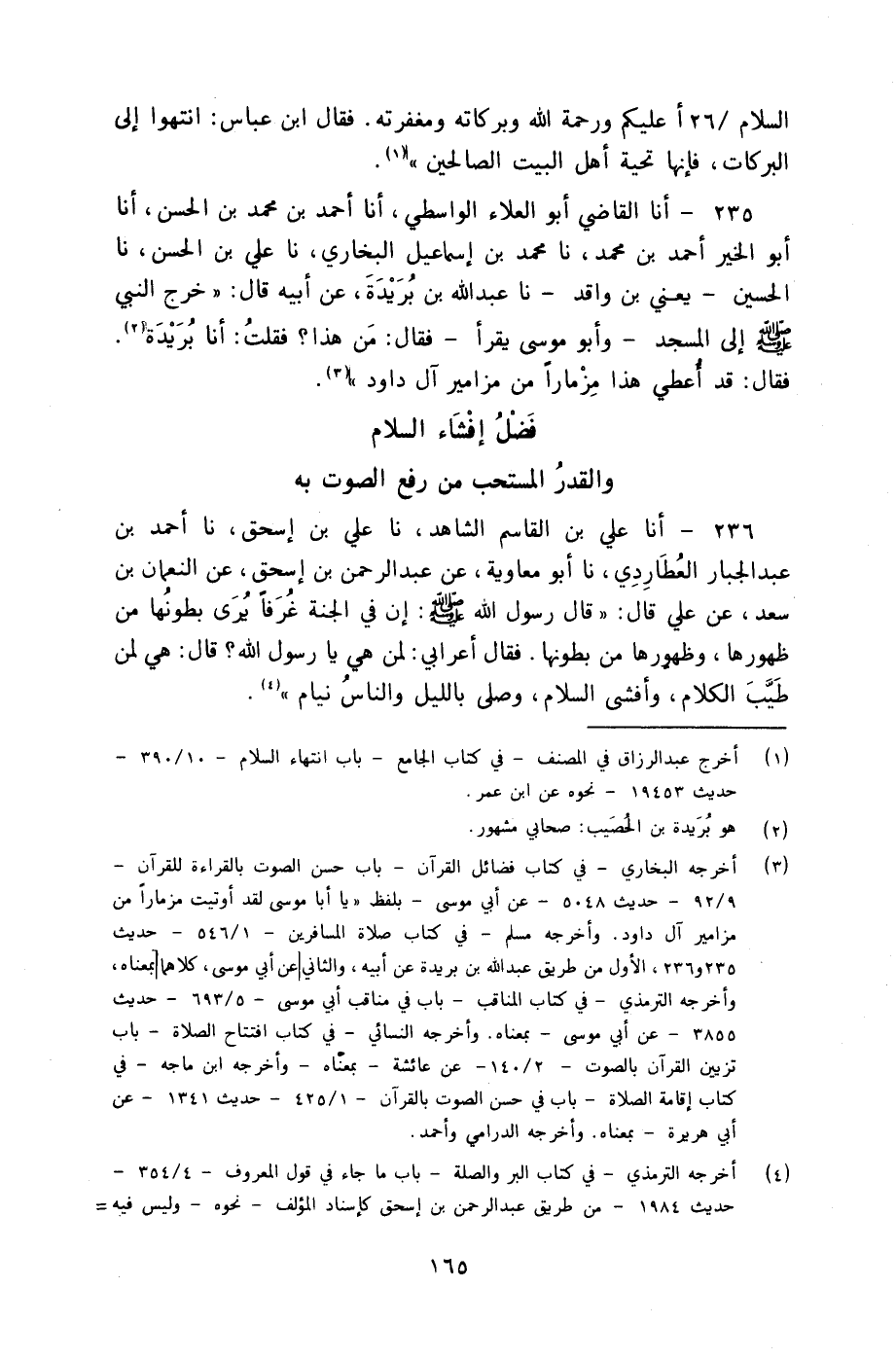 235 - أنا الْقَاضِي أَبُو الْعَلَاءِ الْوَاسِطِيُّ، أنا أَحْمَدُ بْنُ مُحَمَّدِ بْنِ الْحَسَنِ، أنا أَبُو الْخَيْرِ أَحْمَدُ بْنُ مُحَمَّدٍ، نا مُحَمَّدُ بْنُ إِسْمَاعِيلَ الْبُخَارِيُّ، نا عَلِيُّ بْنُ الْحَسَنِ، نا الْحُسَيْنُ، يَعْنِي ابْنَ وَاقِدٍ، نا عَبْدُ اللَّهِ بْنُ بُرَيْدَةَ، عَنْ أَبِيهِ، قَالَ: خَرَجَ النَّبِيُّ صَلَّى اللهُ عَلَيْهِ وَسَلَّمَ إِلَى الْمَسْجِدِ - وَأَبُو مُوسَى يَقْرَأُ - فَقَالَ: مَنْ هَذَا؟ فَقُلْتُ: أَنَا بُرَيْدَةُ، فَقَالَ: §«قَدْ أُعْطِيَ هَذَا مِزْمَارًا مِنْ مَزَامِيرِ آلِ دَاوُدَ»