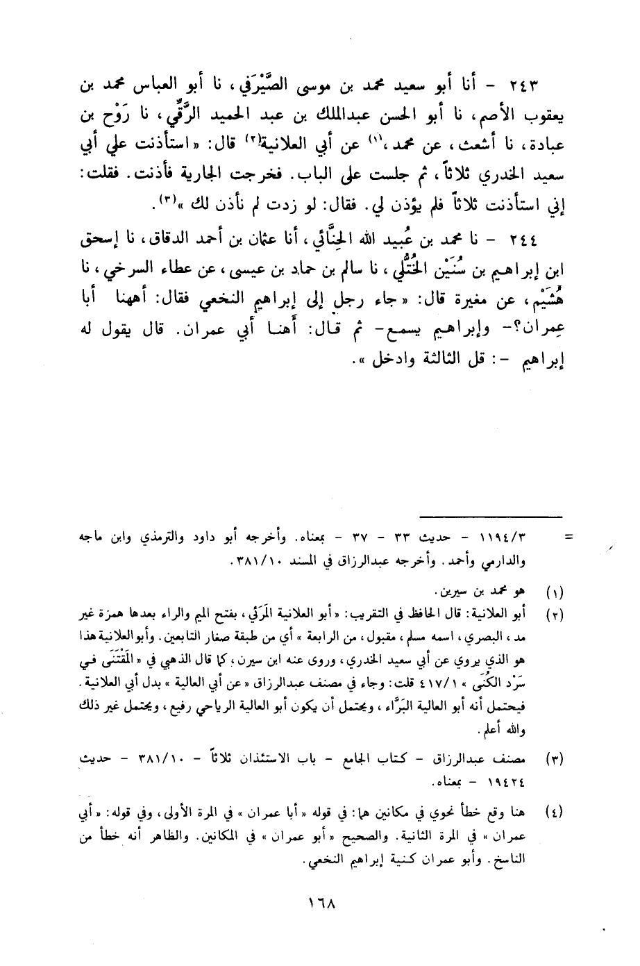 243 - أنا أَبُو سَعِيدٍ مُحَمَّدُ بْنُ مُوسَى الصَّيْرَفِيُّ، نا أَبُو الْعَبَّاسِ مُحَمَّدُ بْنُ يَعْقُوبَ الْأَصَمُّ، نا أَبُو الْحَسَنِ عَبْدُ الْمَلِكِ بْنُ عَبْدِ الْحَمِيدِ الرَّقِّيُّ، نا رَوْحُ بْنُ عُبَادَةَ، نا أَشْعَثُ، عَنْ مُحَمَّدٍ، عَنْ أَبِي الْعَلَانِيَةِ، قَالَ: " اسْتَأْذَنْتُ عَلَى أَبِي سَعِيدٍ الْخُدْرِيِّ ثَلَاثًا، ثُمَّ جَلَسْتُ عَلَى الْبَابِ فَخَرَجَتِ الْجَارِيَةُ فَأَذِنَتْ، فَقُلْتُ: إِنِّي §اسْتَأْذَنْتُ ثَلَاثًا، فَلَمْ يُؤْذَنْ لِي، فَقَالَ: «لَوْ زِدْتَ لَمْ نَأْذَنْ لَكَ»