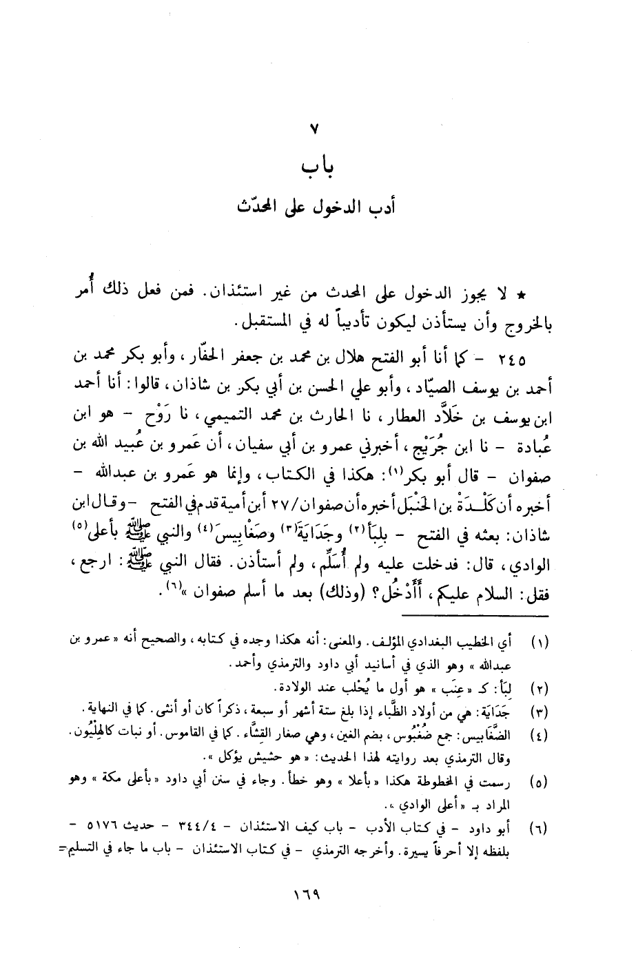 245 - كَمَا أنا أَبُو الْفَتْحِ هِلَالُ بْنُ مُحَمَّدِ بْنِ جَعْفَرٍ الْحَفَّارُ، وَأَبُو بَكْرٍ مُحَمَّدُ بْنُ أَحْمَدَ بْنِ يُوسُفَ الصَّيَّادُ، وَأَبُو عَلِيٍّ الْحَسَنُ بْنُ أَبِي بَكْرِ بْنِ شَاذَانَ، قَالُوا: أنا أَحْمَدُ بْنُ يُوسُفَ بْنِ خَلَّادٍ الْعَطَّارُ، نا الْحَارِثُ بْنُ مُحَمَّدٍ التَّمِيمِيُّ، نا رَوْحٌ هُوَ ابْنُ عُبَادَةَ، نا ابْنُ جُرَيْجٍ، أَخْبَرَنِي عَمْرُو بْنُ أَبِي سُفْيَانَ، أَنَّ عَمْرَو بْنَ عَبْدِ اللَّهِ بْنِ صَفْوَانَ - قَالَ: أَبُو بَكْرٍ: هَكَذَا فِي الْكِتَابِ، وَإِنَّمَا هُوَ عَمْرُو بْنُ عَبْدِ اللَّهِ - أَخْبَرَهُ أَنَّ كَلَدَةَ بْنَ الْحَنْبَلِ أَخْبَرَهُ أَنَّ صَفْوَانَ بْنَ أُمَيَّةَ قَدِمَ فِي الْفَتْحِ - وَقَالَ ابْنُ شَاذَانَ: بَعَثَهُ فِي الْفَتْحِ - بِلِبَأٍ وَجَدَايَةٍ وَصَغَابِيسَ - وَالنَّبِيُّ صَلَّى اللهُ عَلَيْهِ وَسَلَّمَ بِأَعْلَى الْوَادِي، قَالَ: فَدَخَلْتُ عَلَيْهِ وَلَمْ أُسَلِّمْ وَلَمْ أَسْتَأْذِنْ، فَقَالَ النَّبِيُّ صَلَّى اللهُ عَلَيْهِ وَسَلَّمَ: " §ارْجِعْ فَقُلِ: السَّلَامُ عَلَيْكُمْ أَأَدْخُلُ؟ «وَذَلِكَ بَعْدَ مَا أَسْلَمَ صَفْوَانُ» -[170]- قَالَ عَمْرٌو: وَأَخْبَرَنِي بِهَذَا الْخَبَرِ أُمَيَّةُ بْنُ صَفْوَانَ، وَلَمْ يَقُلْ سَمِعْتُهُ مِنْ كَلَدَةَ وَإِذَا حَضَرَ جَمَاعَةٌ مِنَ الطَّلَبَةِ بَابَ الْمُحَدِّثِ، وَأَذِنَ لَهُمْ فِي الدُّخُولِ، فَيَنْبَغِي أَنْ يُقِدِّمُوا أَسَنَّهُمْ وَيُدْخِلُوهُ أَمَامَهُمْ، فَإِنَّ ذَلِكَ هُوَ السُّنَّةُ