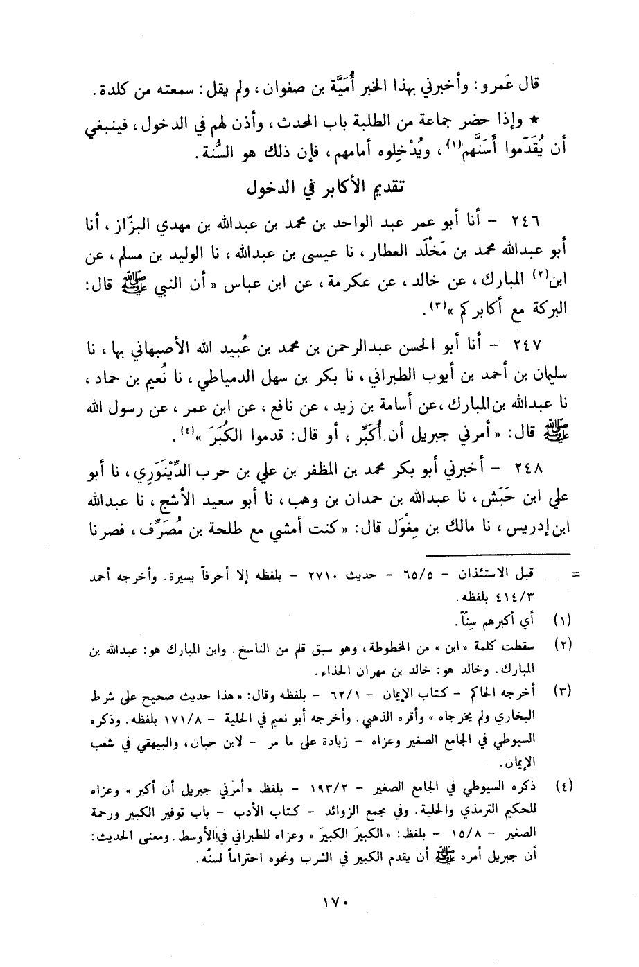 246 - أنا أَبُو عُمَرَ عَبْدُ الْوَاحِدِ بْنُ مُحَمَّدِ بْنِ عَبْدِ اللَّهِ بْنِ مَهْدِيٍّ الْبَزَّازُ، أنا أَبُو عَبْدِ اللَّهِ مُحَمَّدُ بْنُ مَخْلَدٍ الْعَطَّارُ، نا عِيسَى بْنُ عَبْدِ اللَّهِ، نا الْوَلِيدُ بْنُ مُسْلِمٍ، عَنِ ابْنِ الْمُبَارَكِ، عَنْ خَالِدٍ، عَنْ عِكْرِمَةَ، عَنِ ابْنِ عَبَّاسٍ، أَنَّ النَّبِيَّ صَلَّى اللهُ عَلَيْهِ وَسَلَّمَ، قَالَ: §«الْبَرَكَةُ مَعَ أَكَابِرِكُمْ»